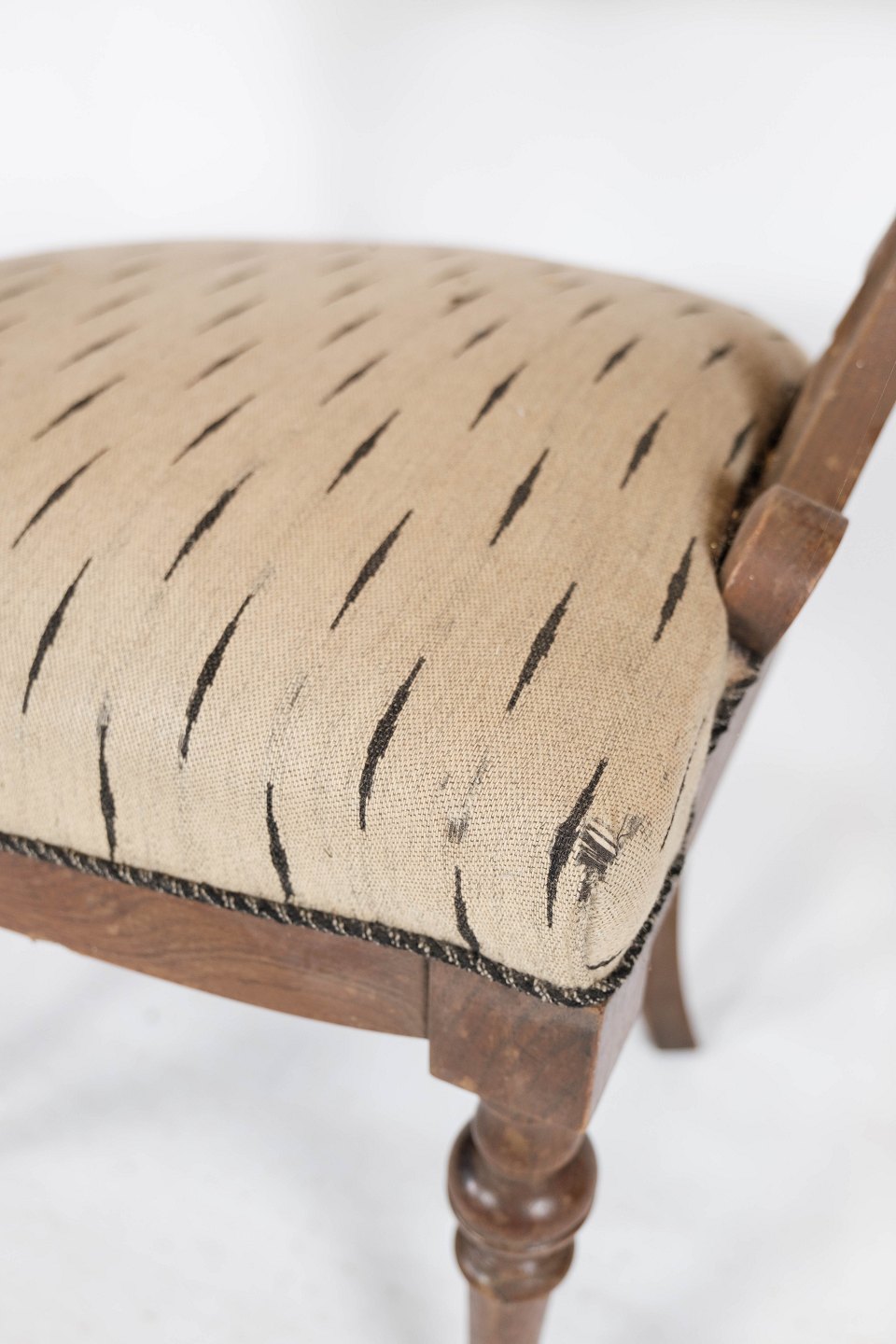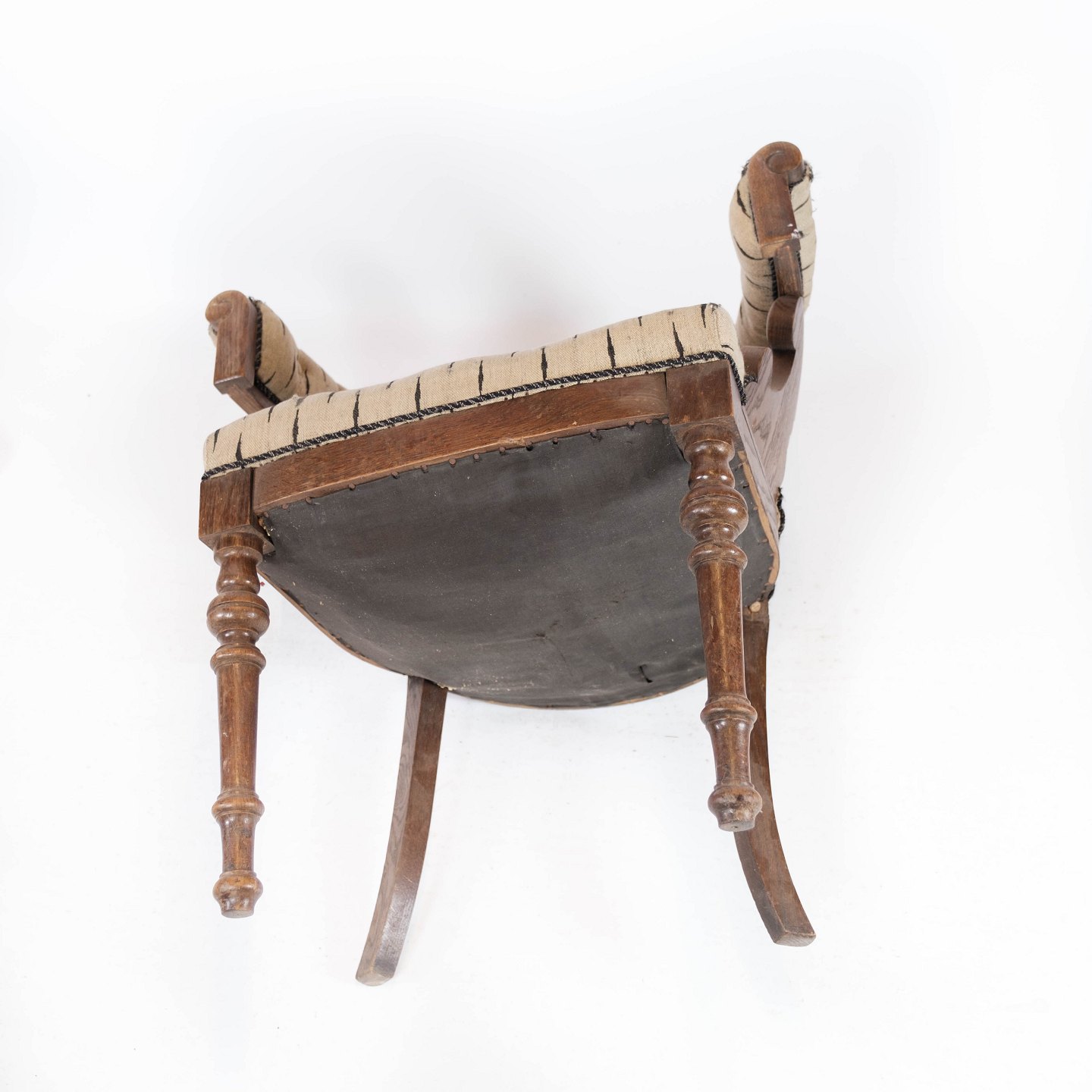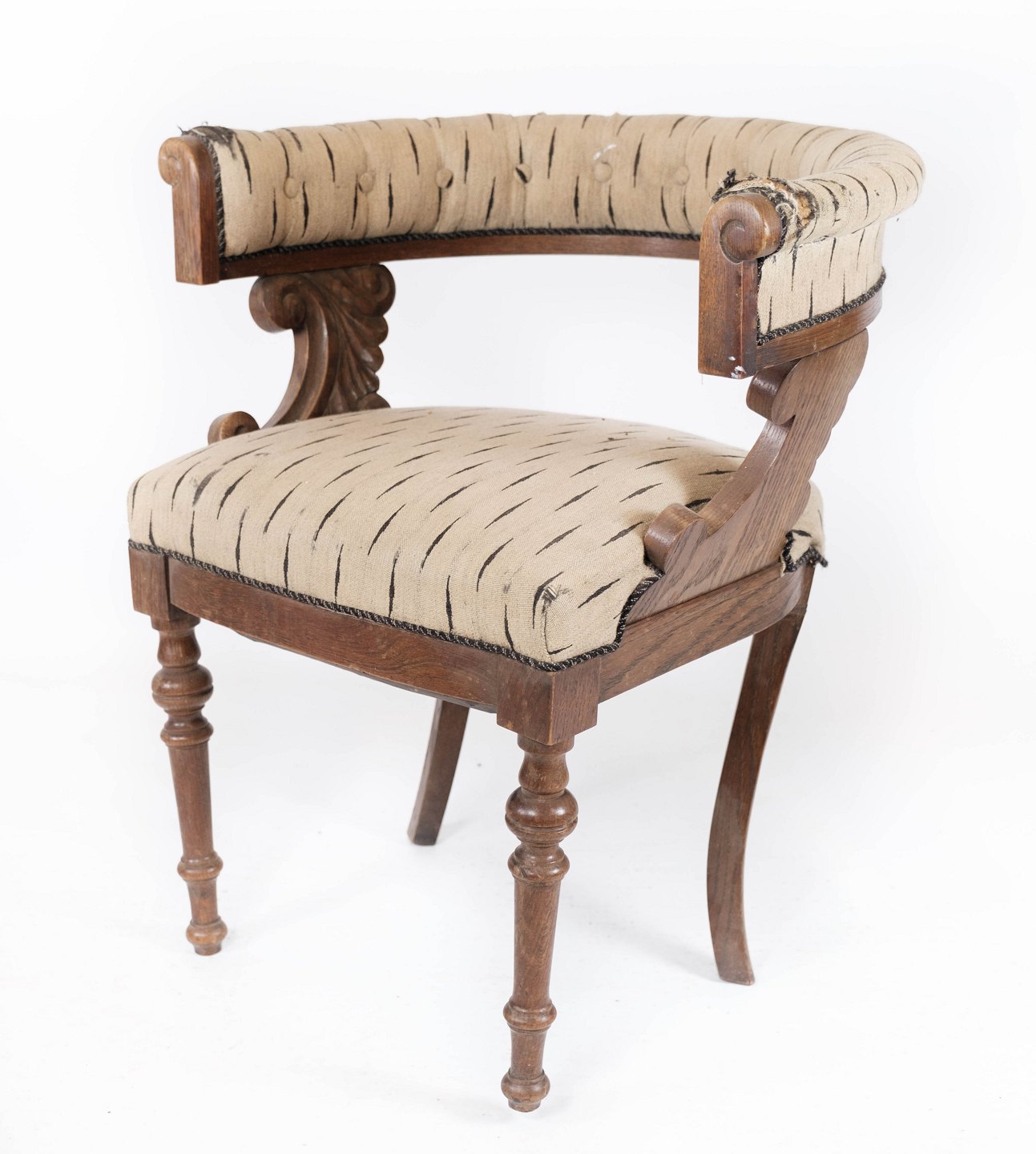 Antik armstol af eg og med original polstring af lyst stof, fra 1920erne.