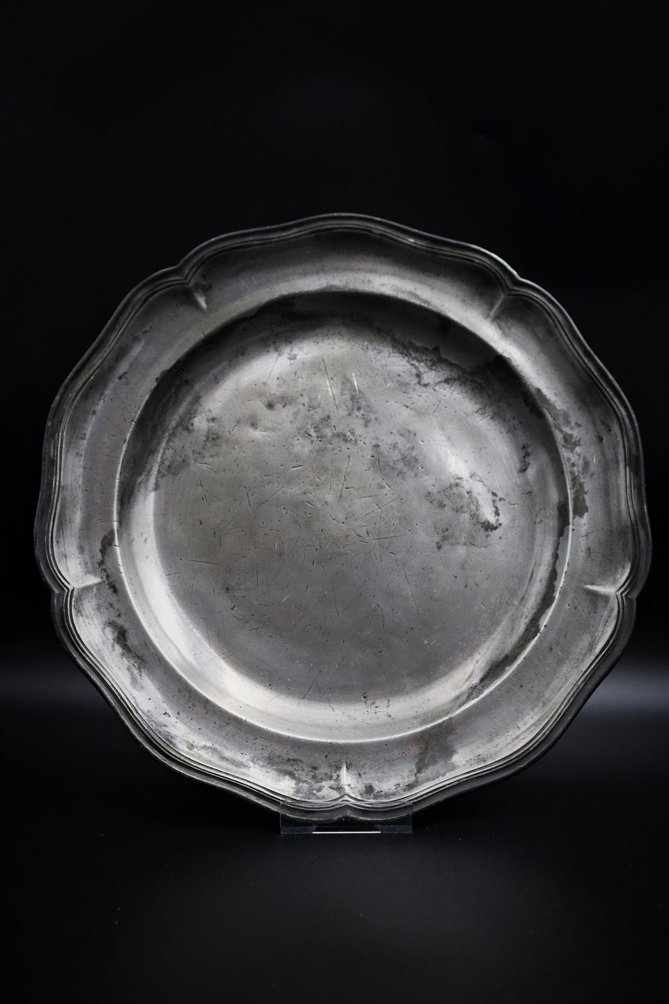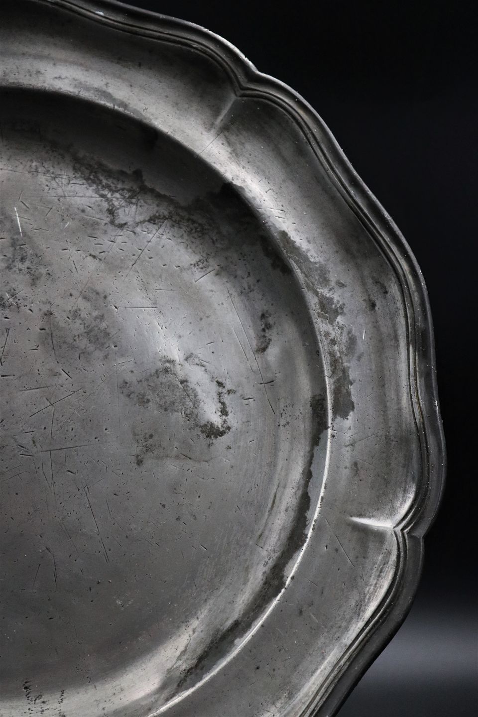 Dekorativt antikt 1700 tals tin fad med bølget kant og en rigtig fin patina.