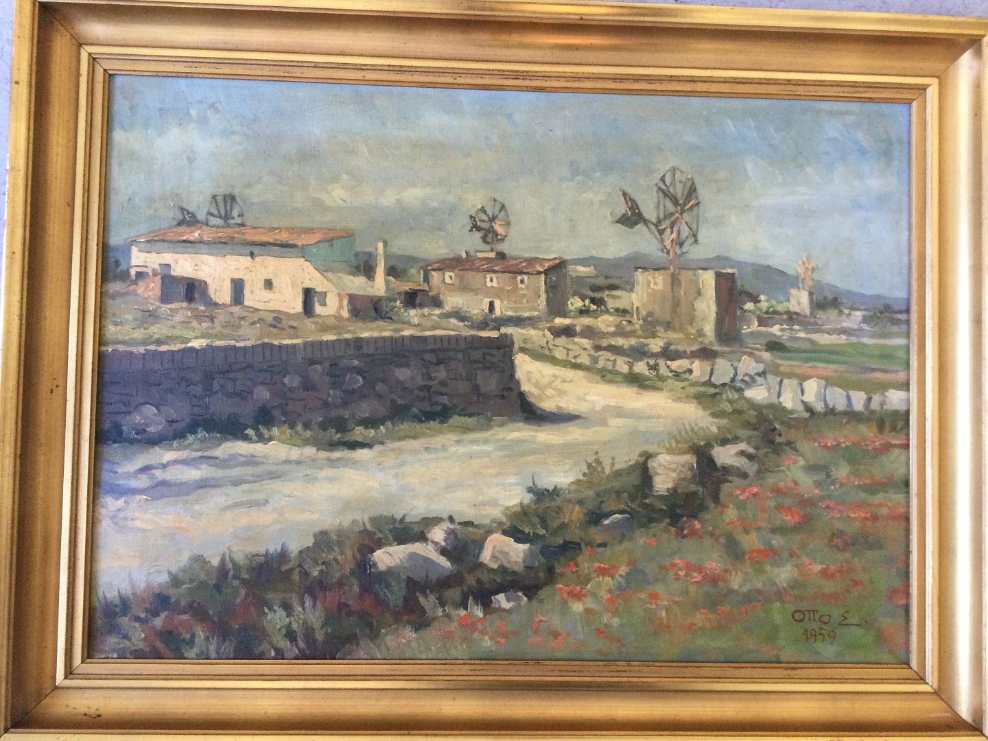 Maleri af Otto Eilertsen - Sydlandsk parti med klippegrund og vindmøller 1959.