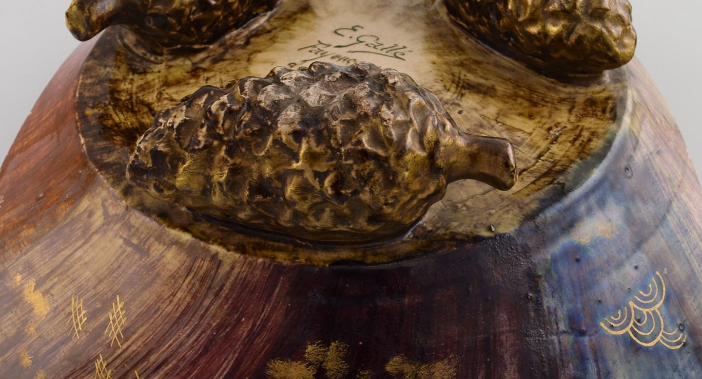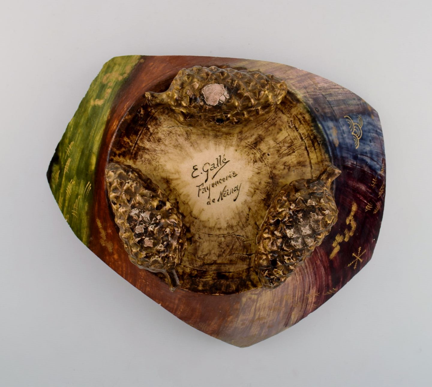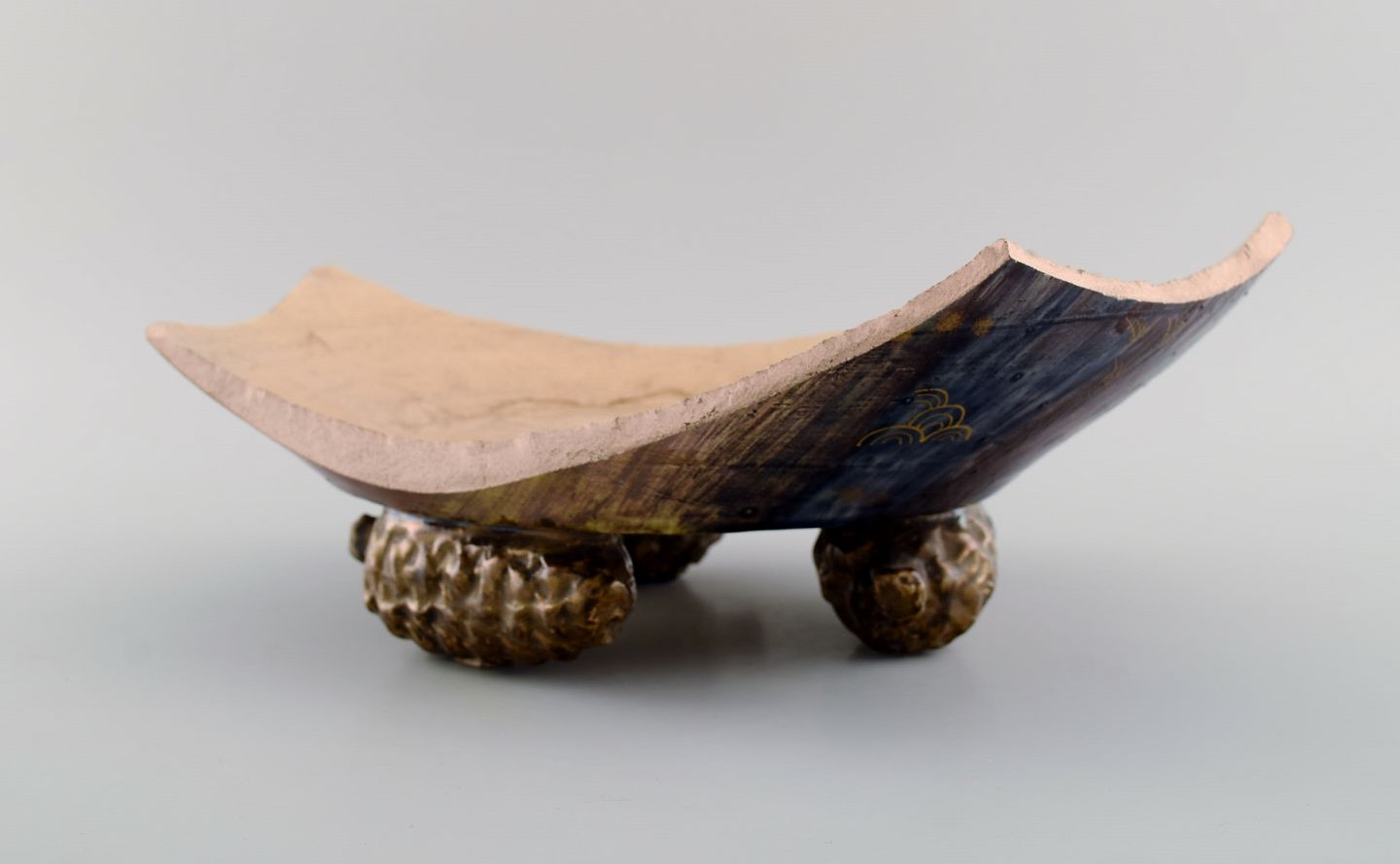 Emile Gallé for St. Clement, Nancy. Antik art nouveau skål i håndmalet fajance med fødder formet som grankogler. Ca. 1880.