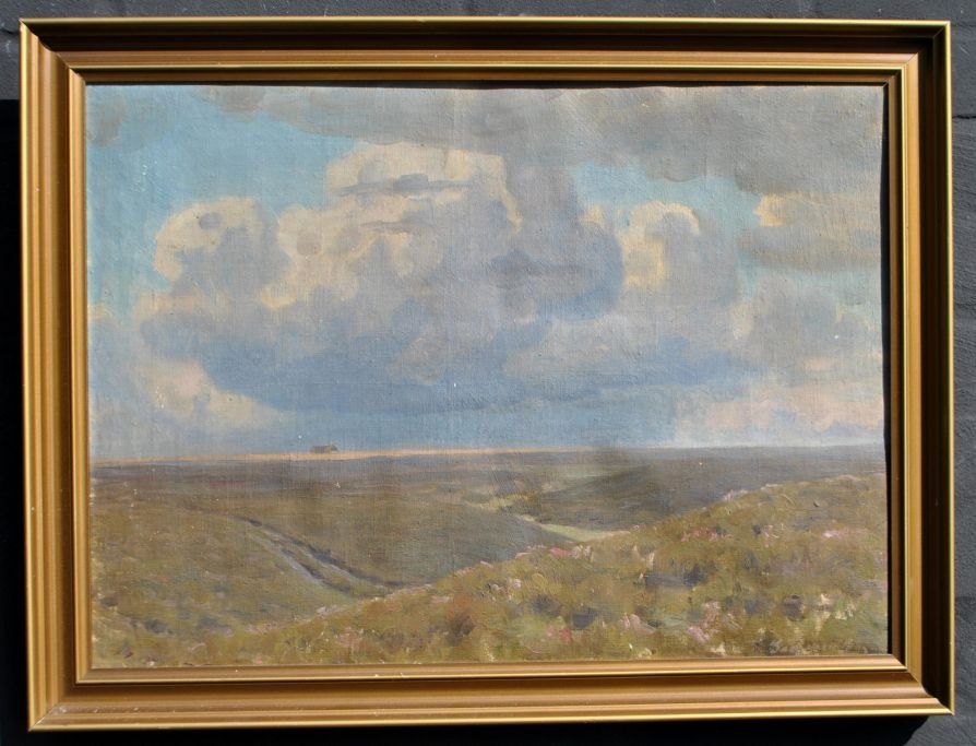 Gammeltoft, L. (19/20. årh.): Tordenvejr over Karup Hede. Olie på lærred. Signeret. 39 x 55 cm.