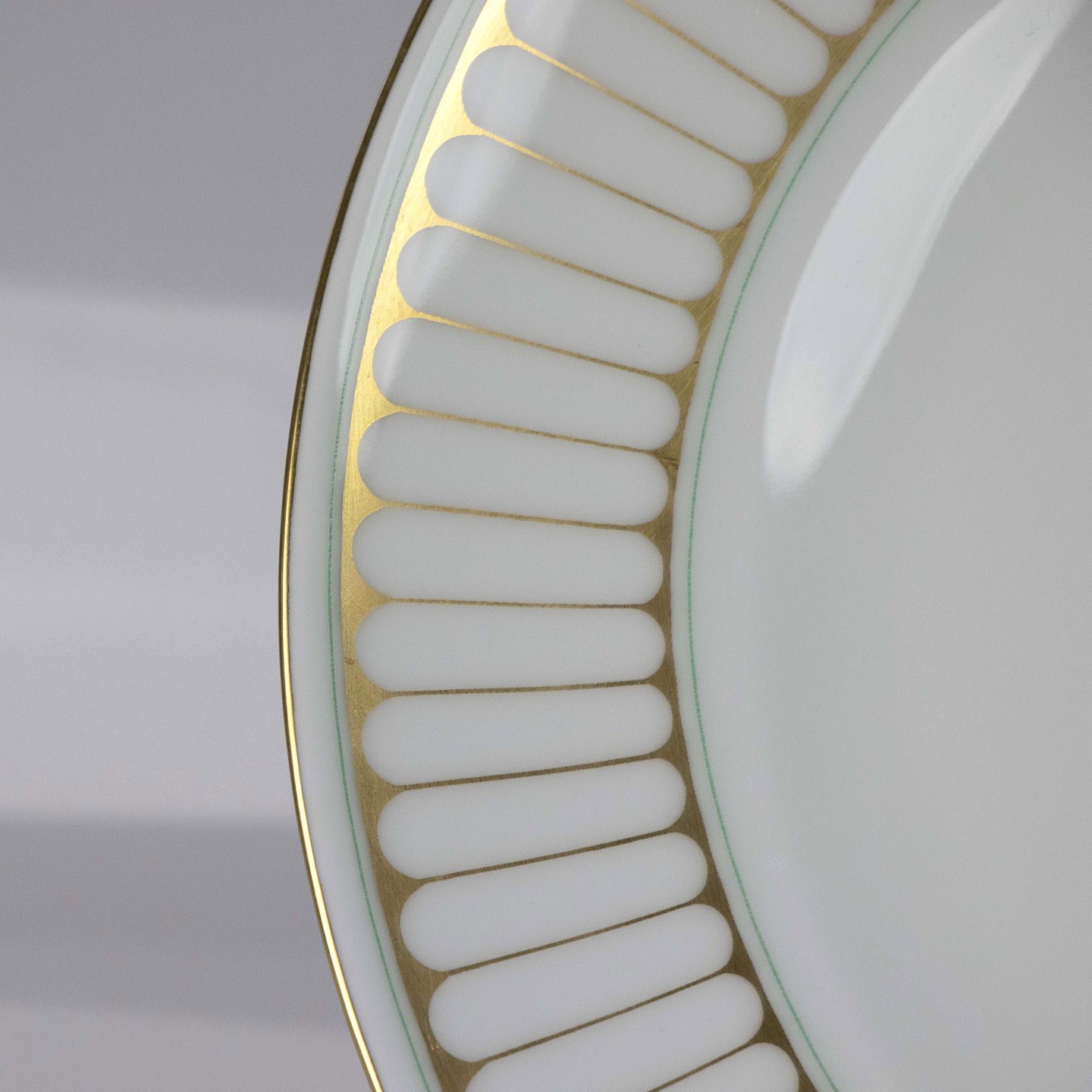 Tallerken fremstillet i hvidt porcelæn med gylden buet bord og grøn streg.