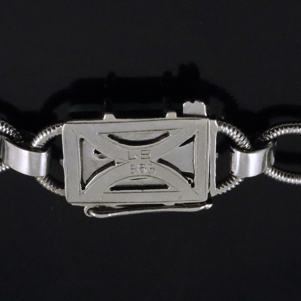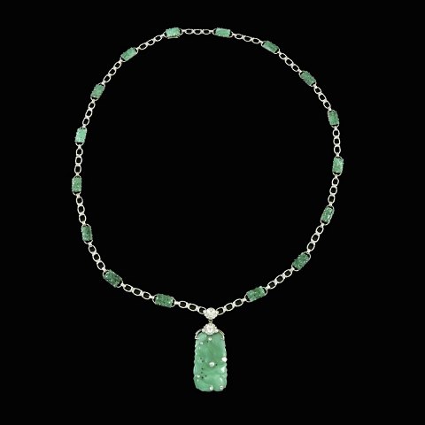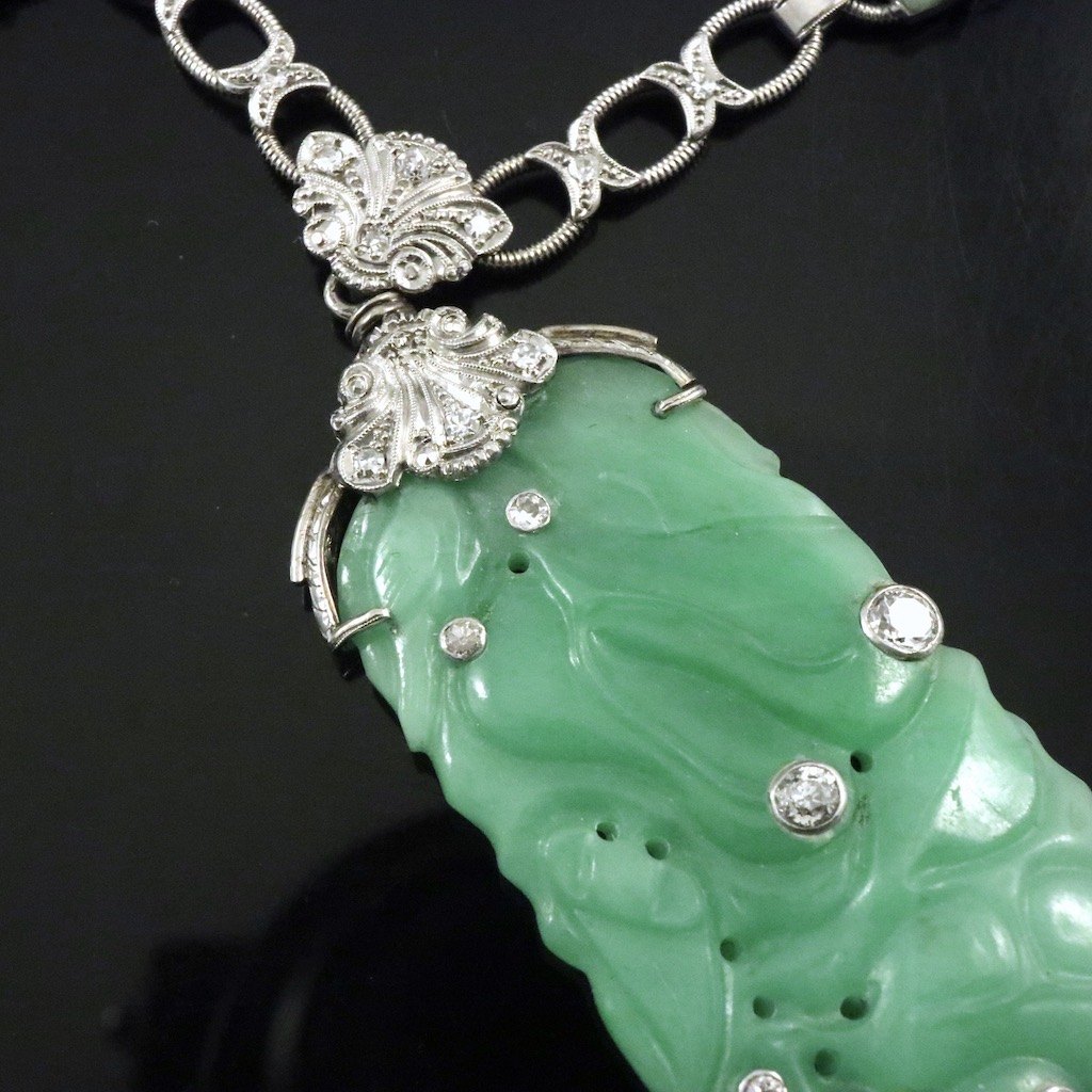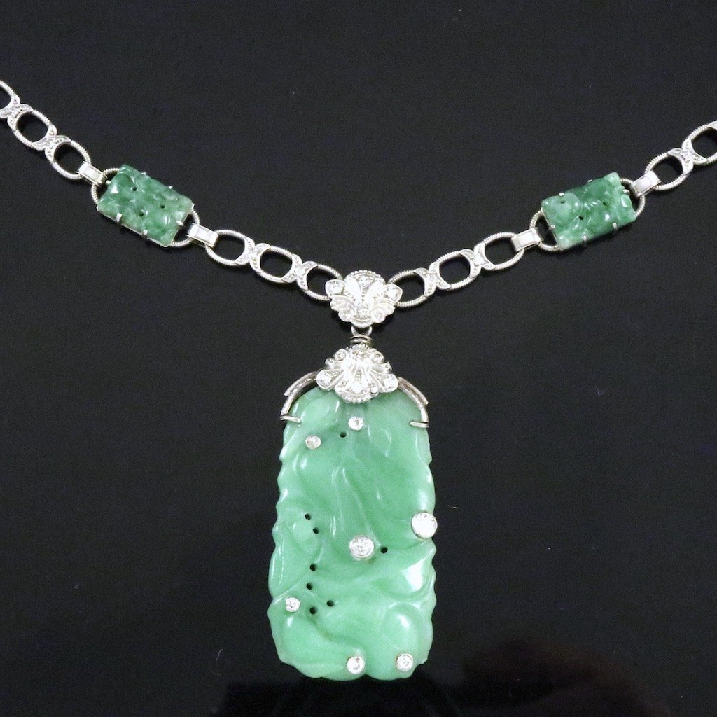 14k White Gold Necklace with Jade and Diamonds.