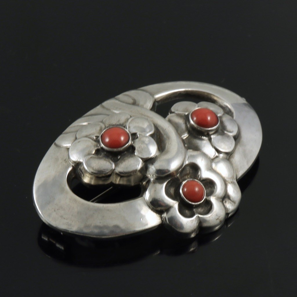Georg Jensen. 830s Silver Brooch with Coral #28.
