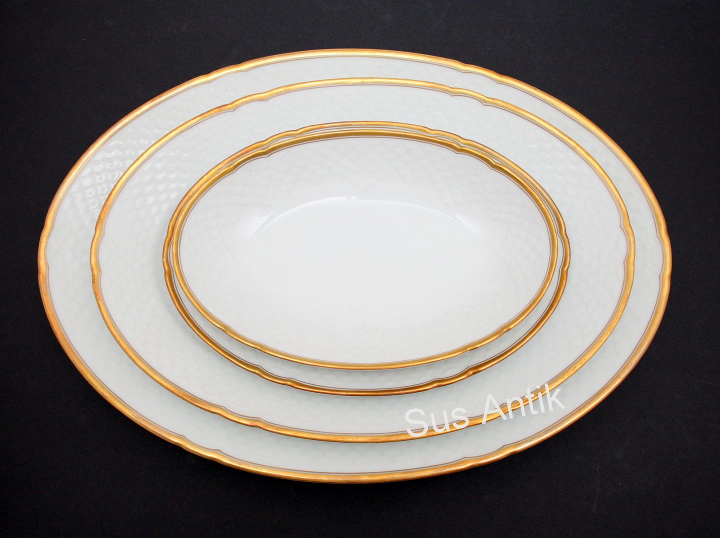 Bing & Grøndahl, Hartmann, fade. Hvidt porcelæn med guldkant, samt guldstreg.