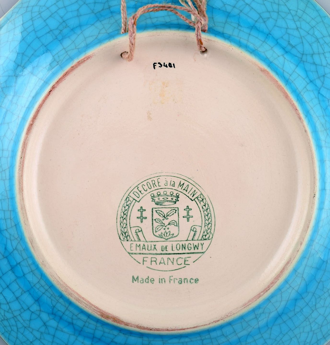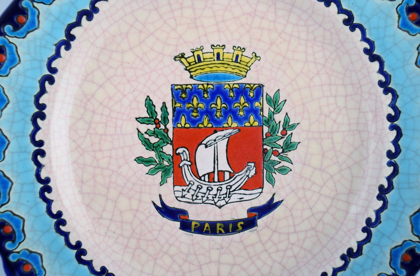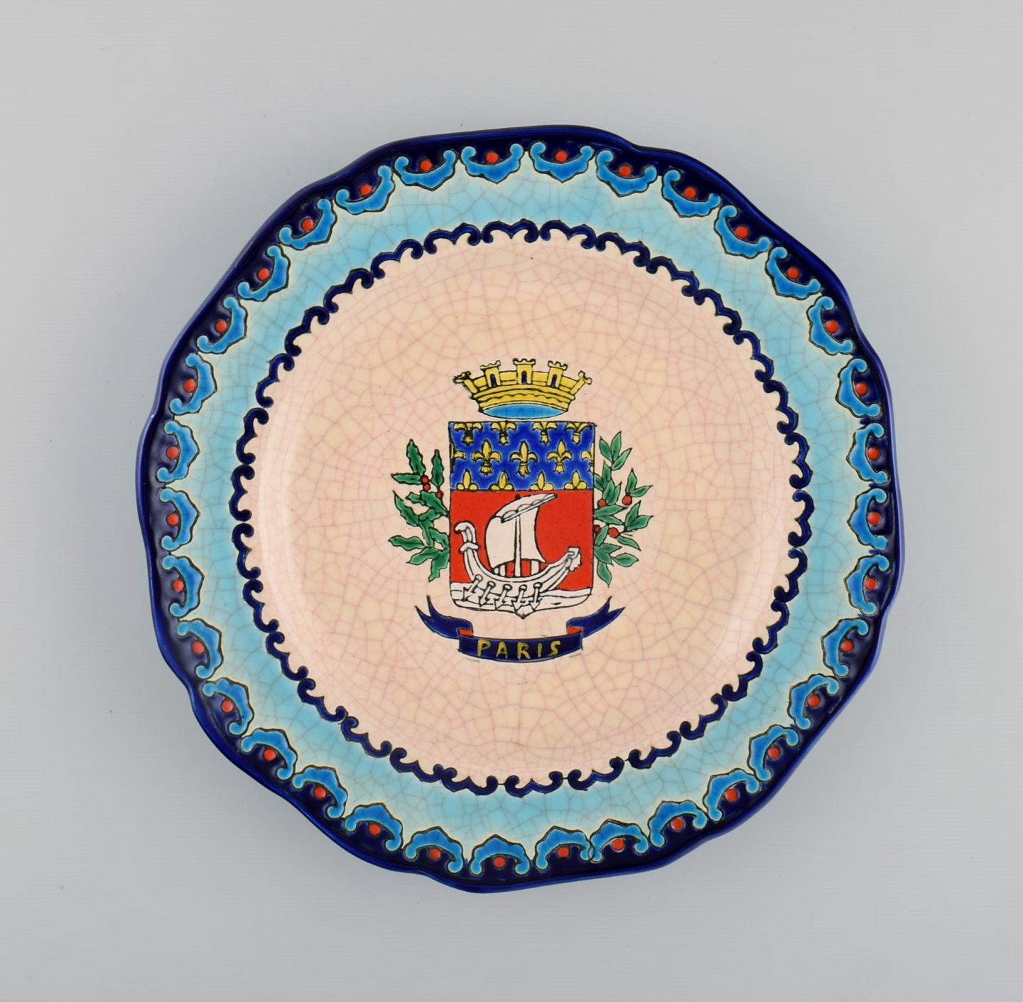 Longwy, Frankrig. Art deco tallerken i glaseret stentøj med håndmalet parisisk våbenskjold og bladværk. 1920/30'erne.
