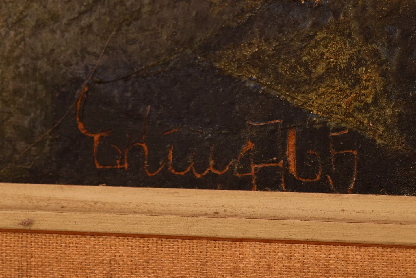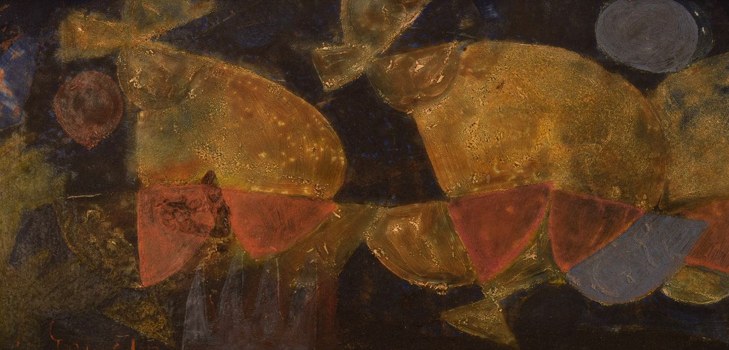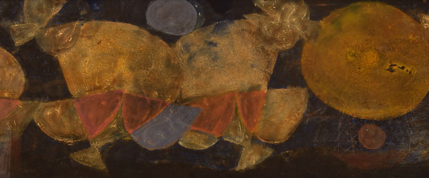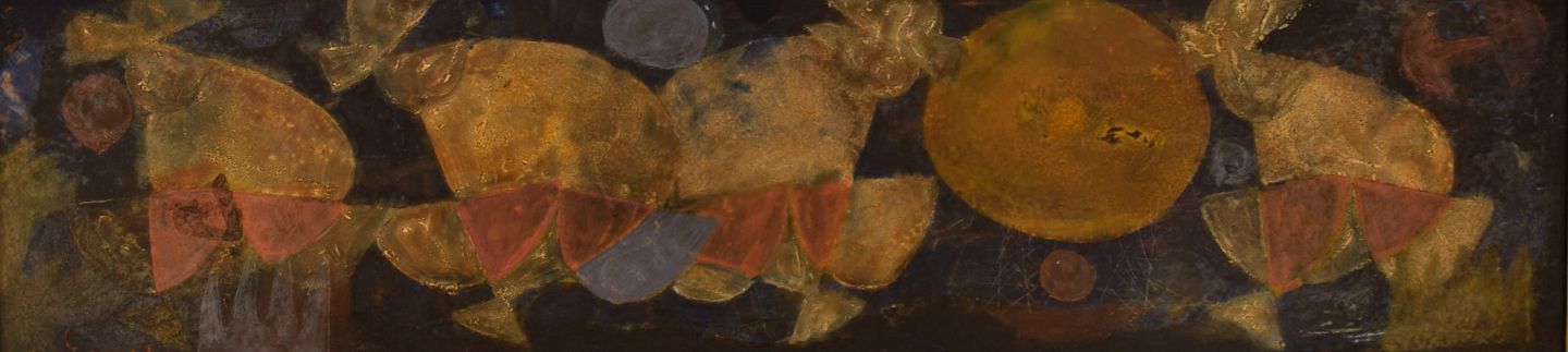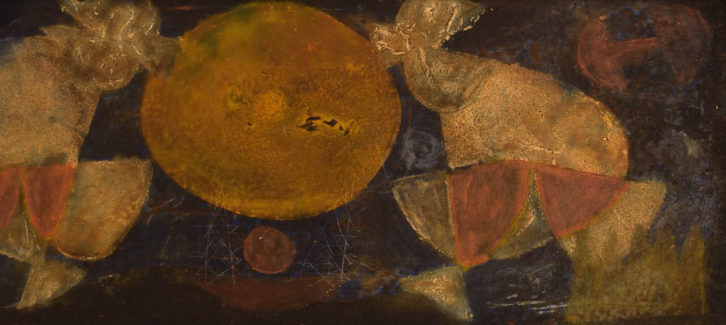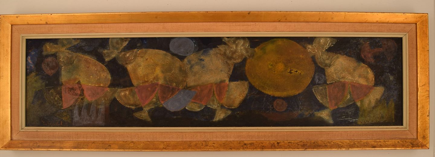Erling Andersen (b. 1937), Denmark. Oil on board. "Mating Dance". Dated 1965.