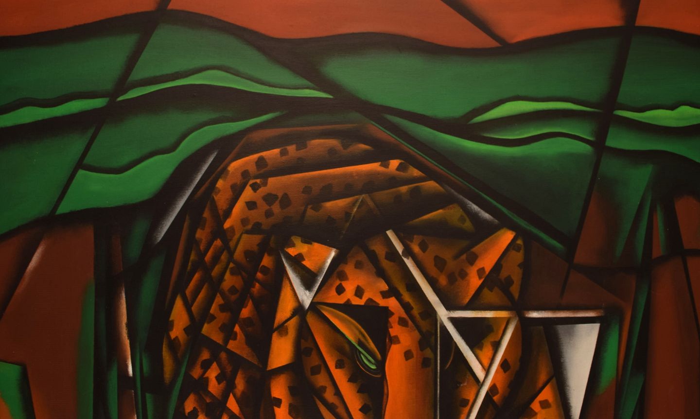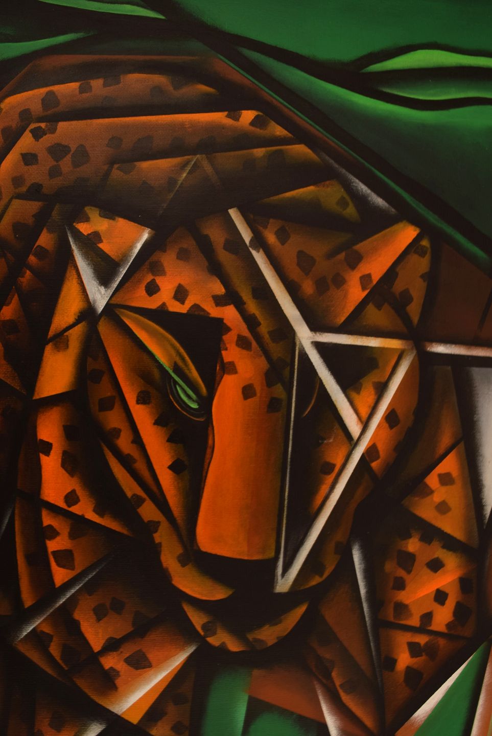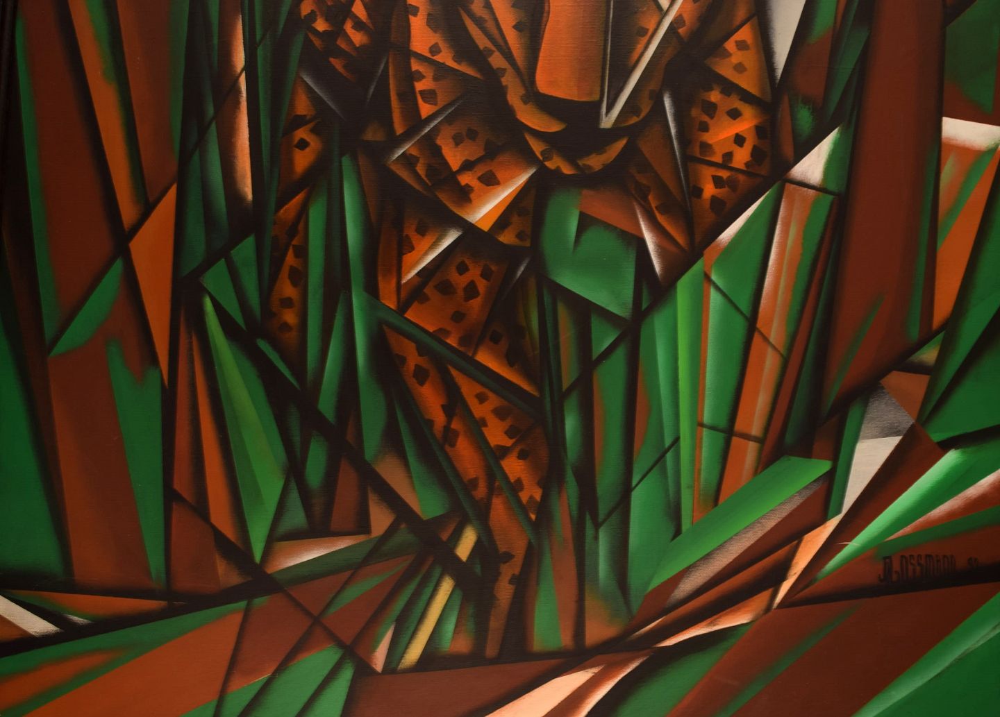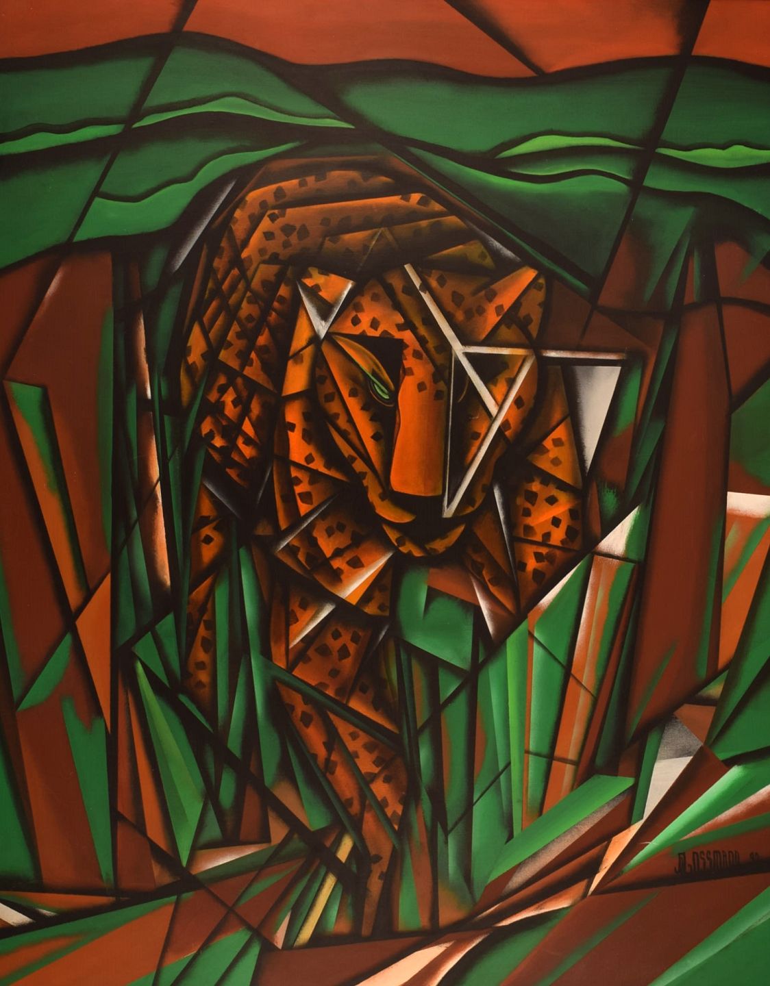 J.L. Gossmann, fransk kunstner. Olie på lærred. Panter i landskab. Kubistisk stil. Dateret 1992.