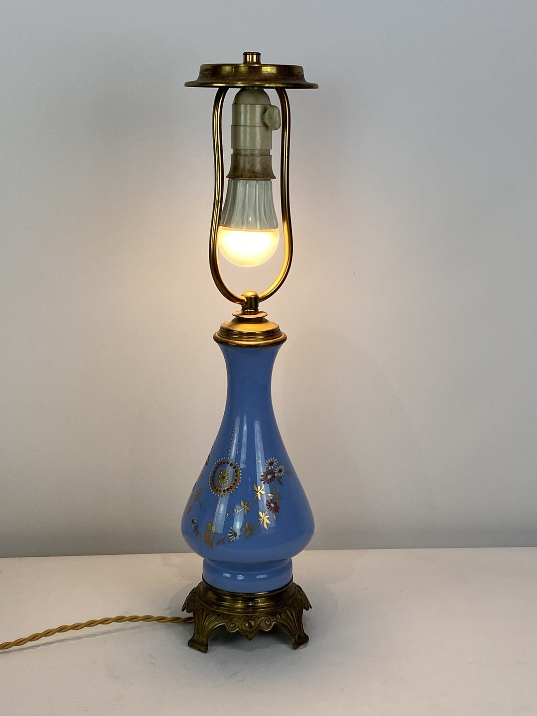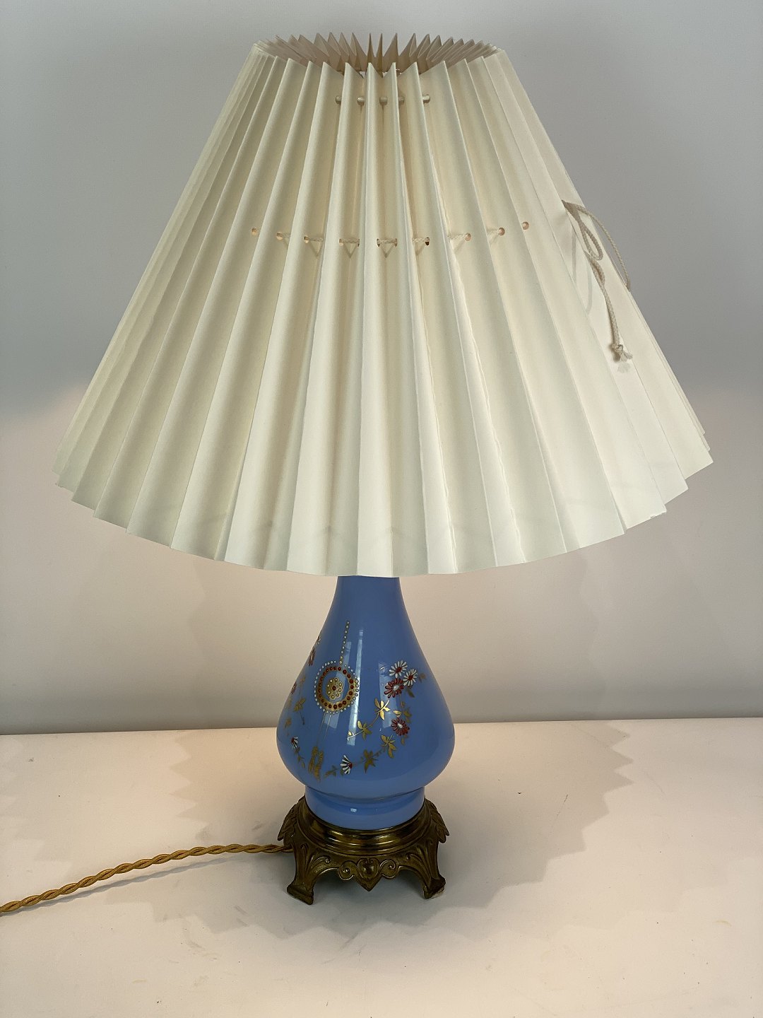 Bordlampe med blåt opal glas dekoreret med guld og af bronze, med papir skærm, fra 1890erne.