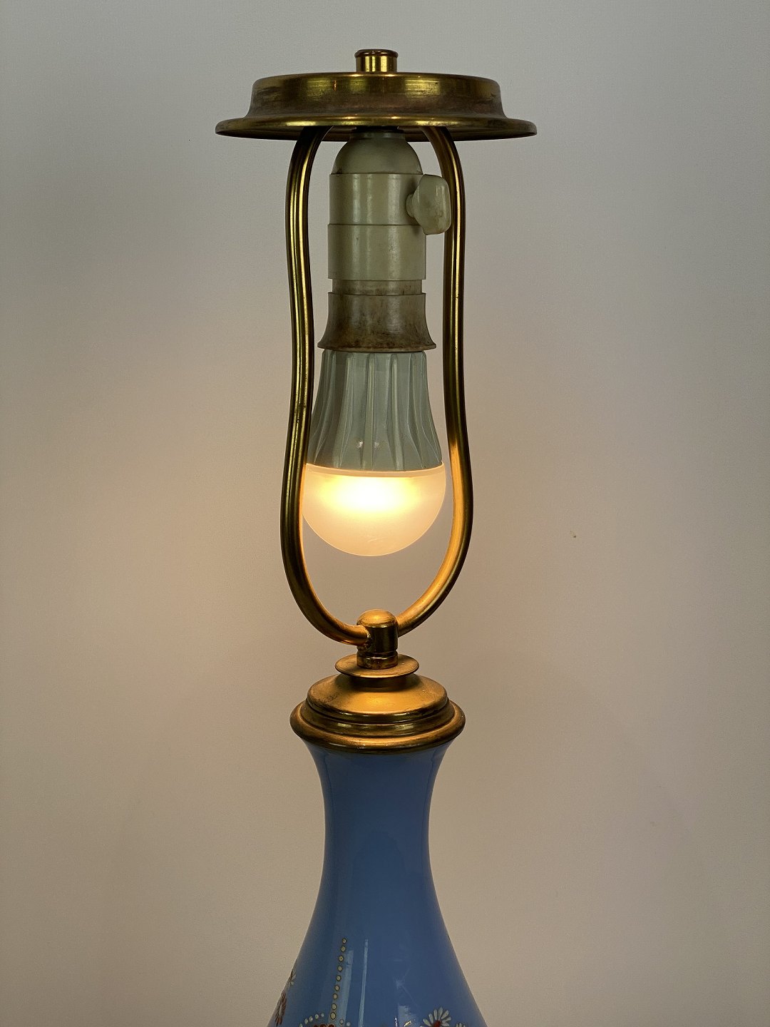 Bordlampe med blåt opal glas dekoreret med guld og af bronze, med papir skærm, fra 1890erne. Lampen er i flot antik stand.