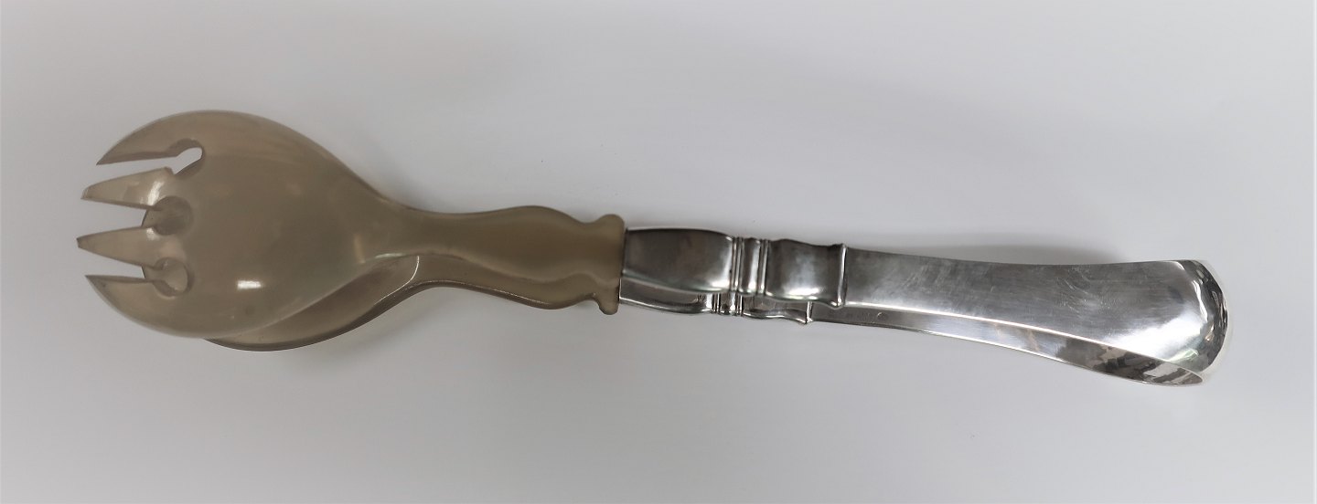 Evald Nielsen. Stor salat tang. Sølv med ben (830). Længde 26 cm. Produceret 1927.