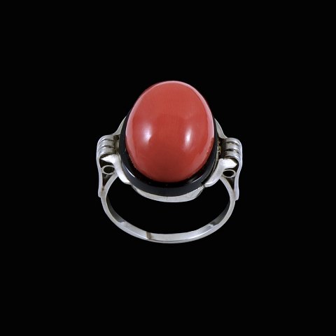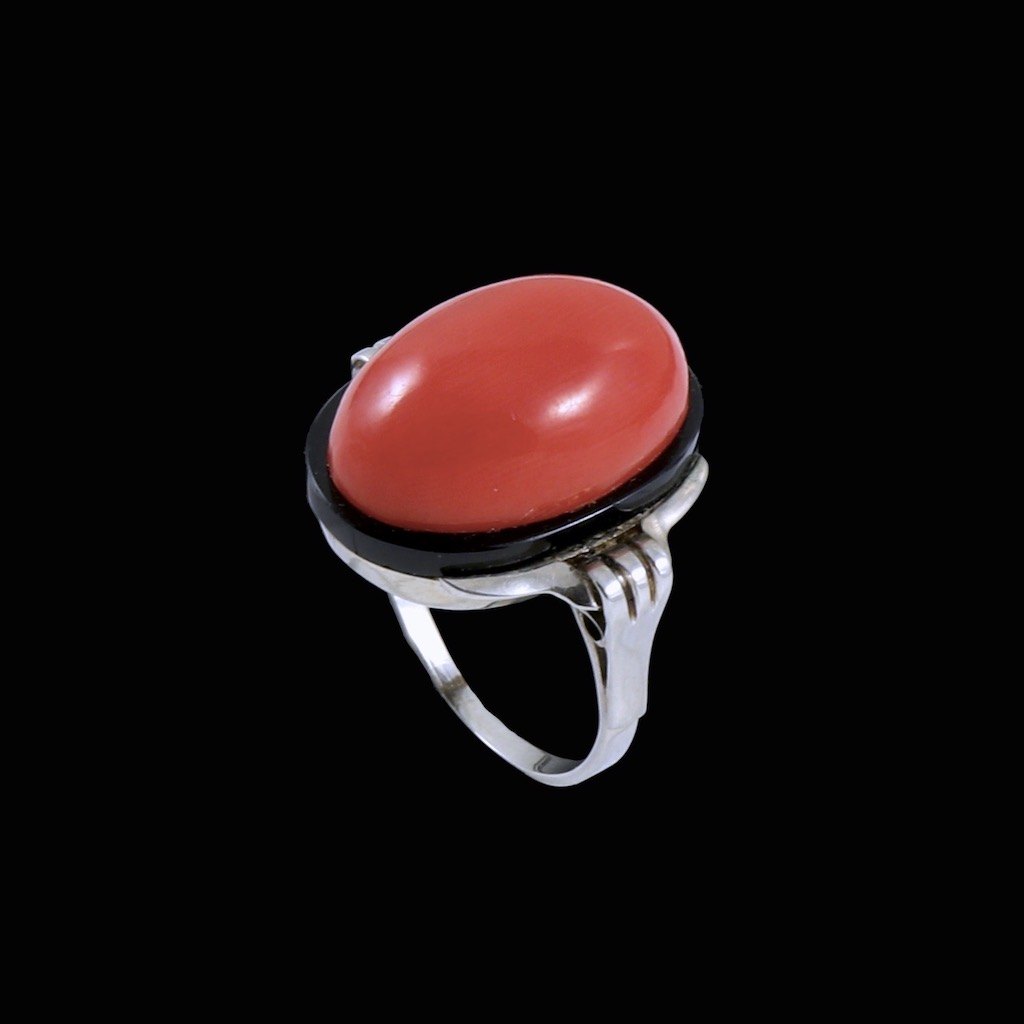 Art deco 14k White Gold Ring with Onyx and Coral.
