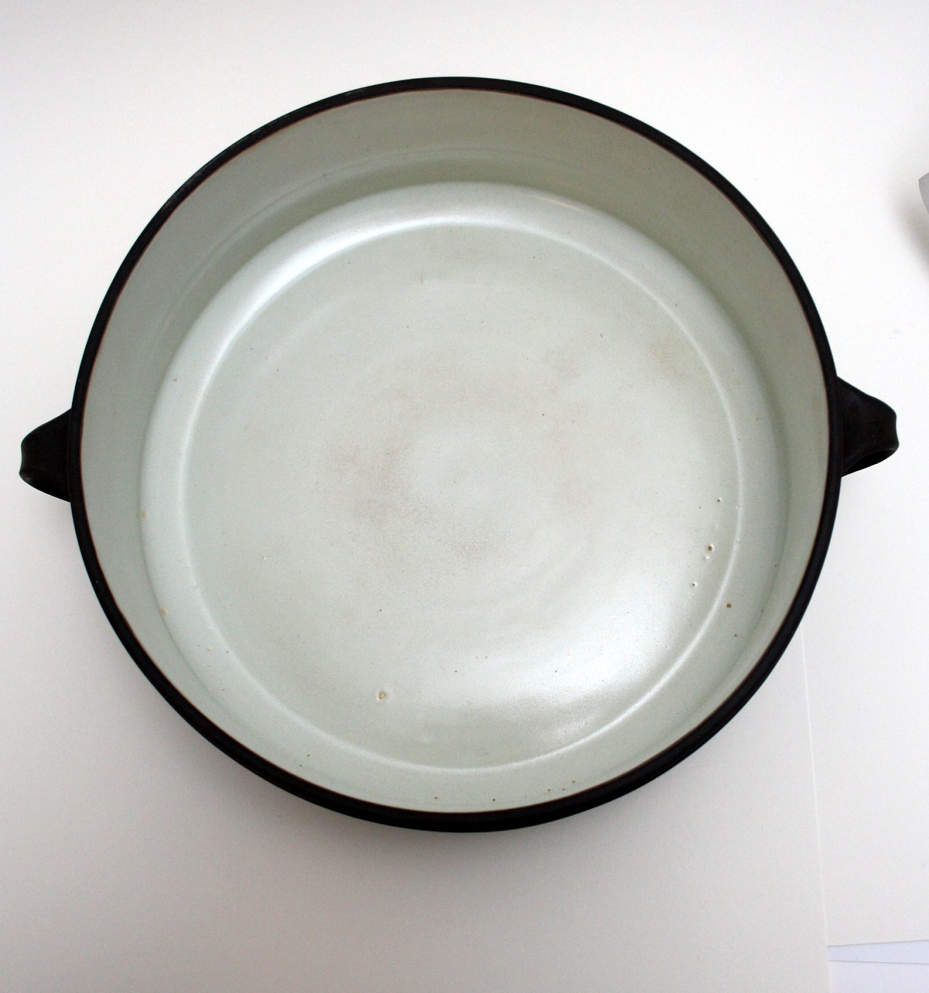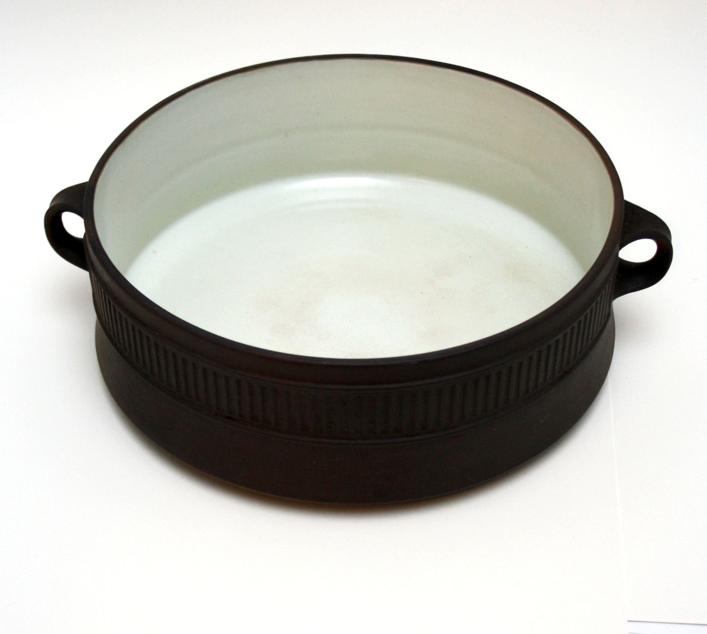 Eslau Danmark, Flamestone. Stor skål med ører, gryde. Indvendig hvid glasur, yderside i rå uglaseret stentøj. Designet af Jens Harald Quistgaard i 1950,erne. Signeret IHQ, Dansk Designs, Denmark. Højde 9,5 cm. Diameter 26,5 cm. Længde 32 cm. Brændingsfejl i glasuren indvendig. Pris: 425 kr. stk. Lager: 1