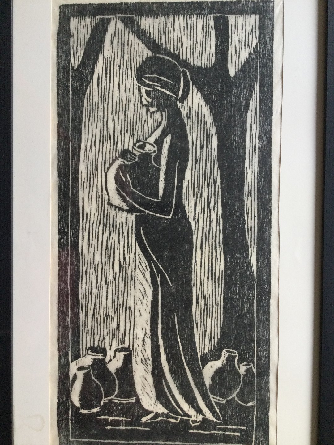 Træsnit af Lone Plaetner - Klassisk kvinde med krukke 1971.