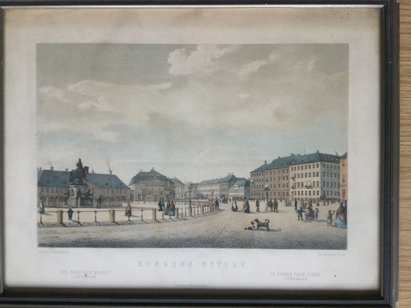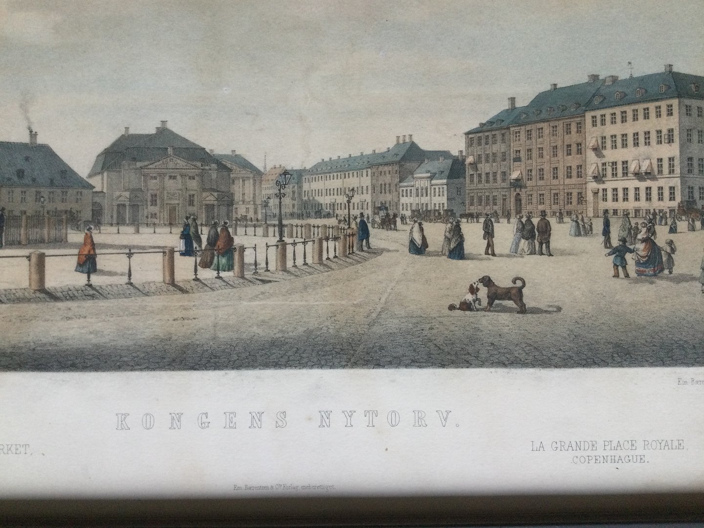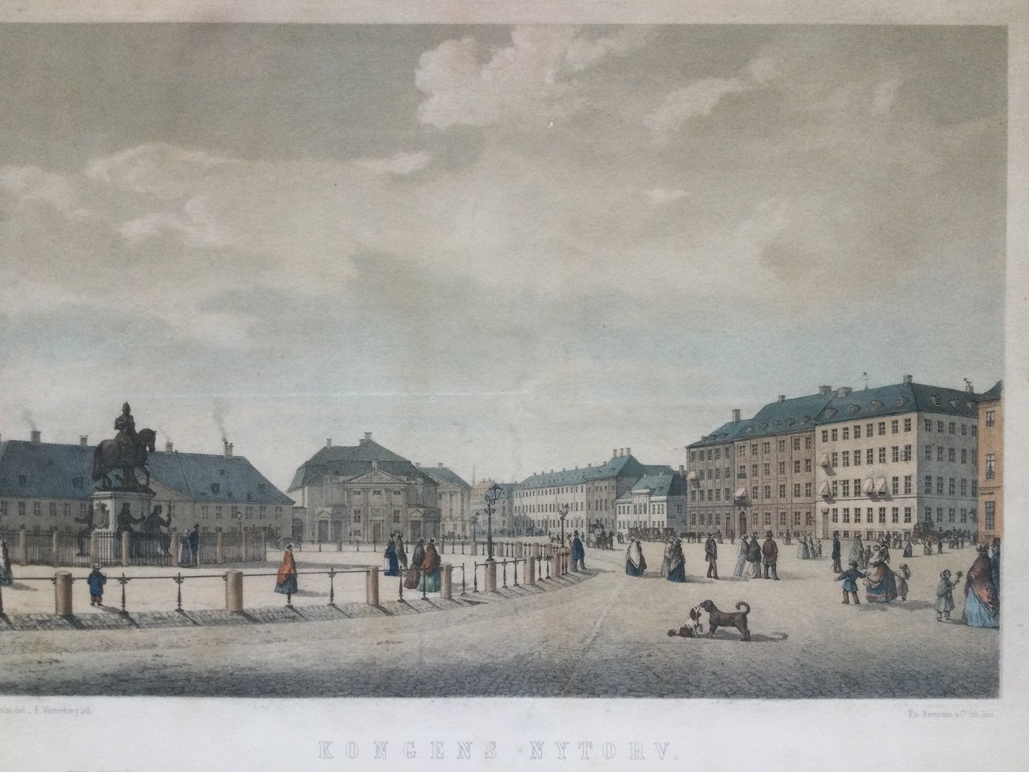 Koloreret litografi fra Kongens Nytorv i København af Edward Westerberg.