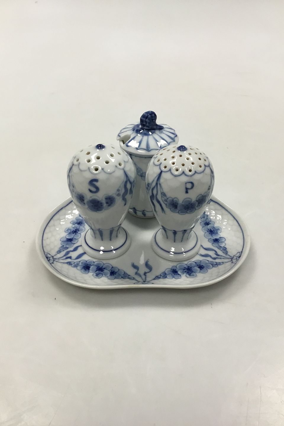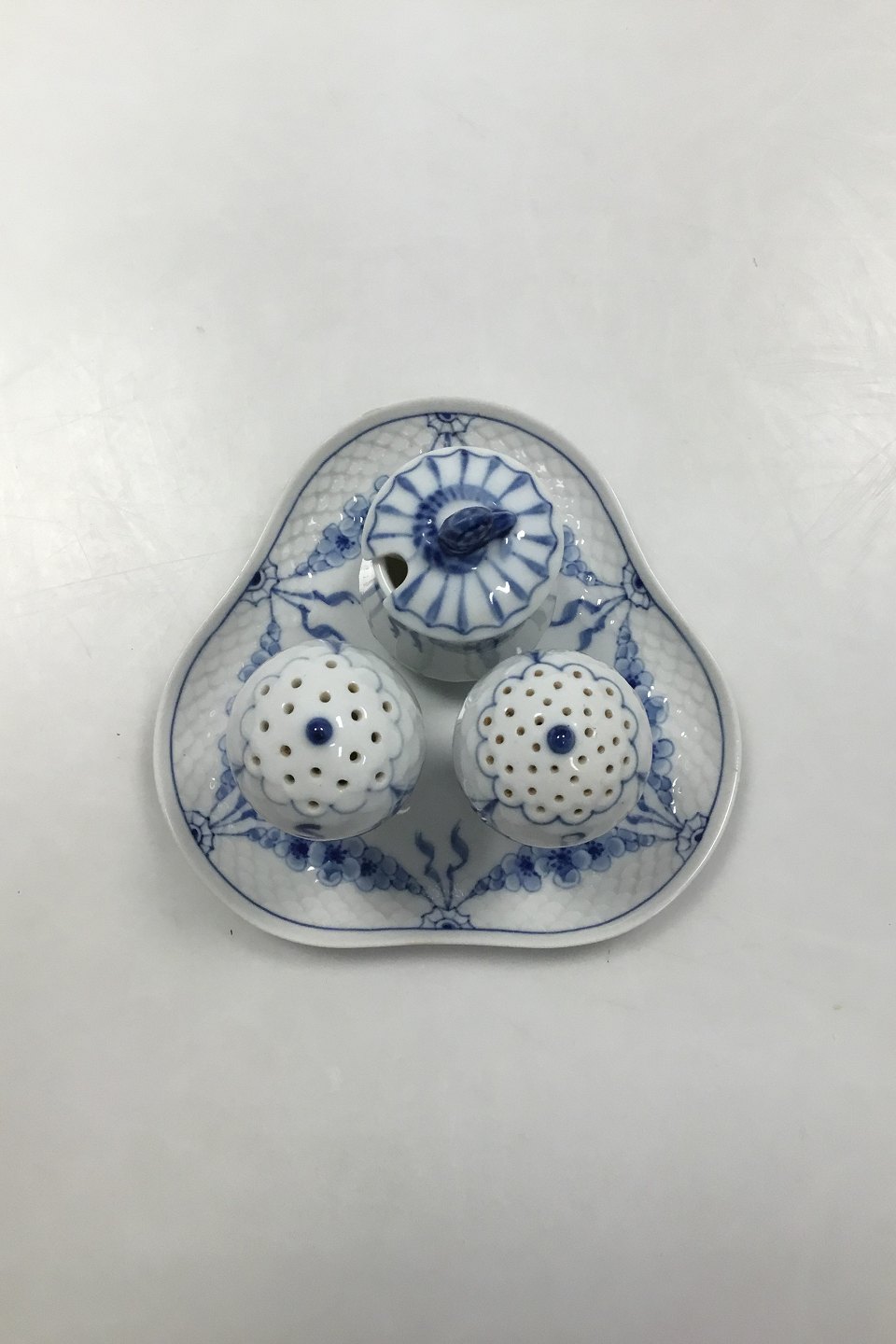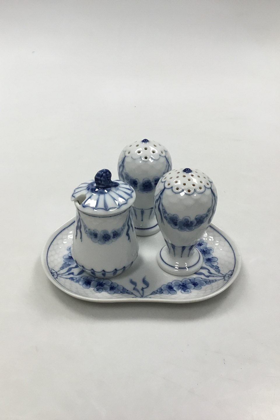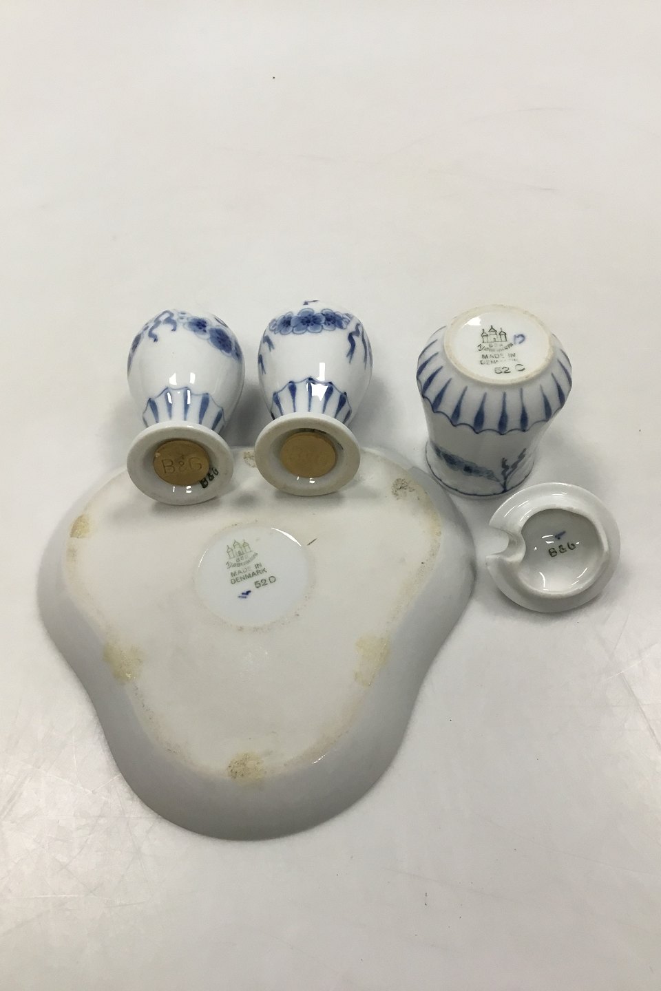 Bing & Grøndahl Empire Plat-de-ménage No 52. Fad No 52D måler 13 cm (5 1/8 in). Sennepskrukke No 52C og Salt- og pebersæt måler 8 cm (3 5/32 in).