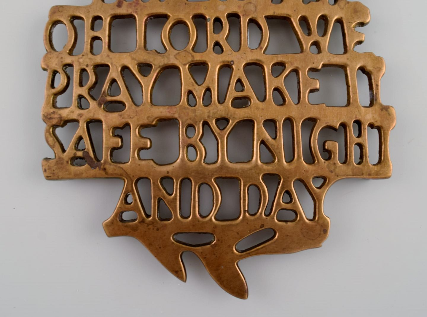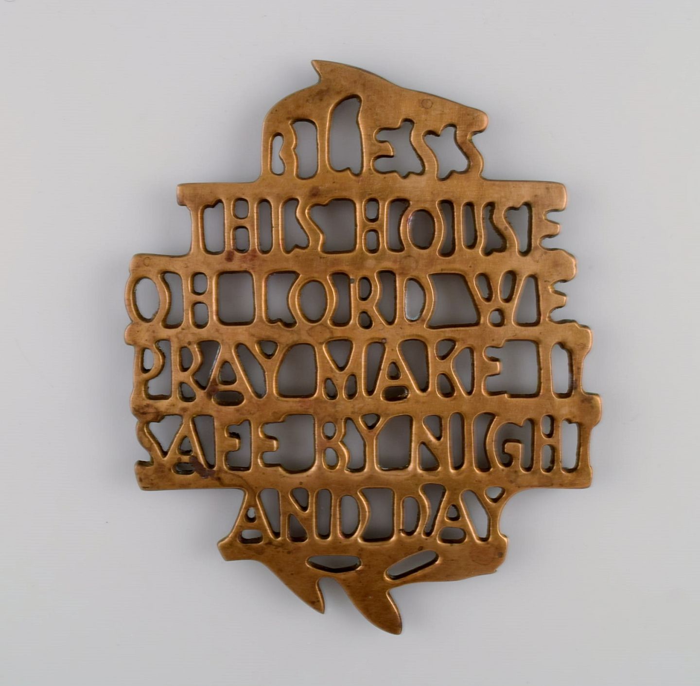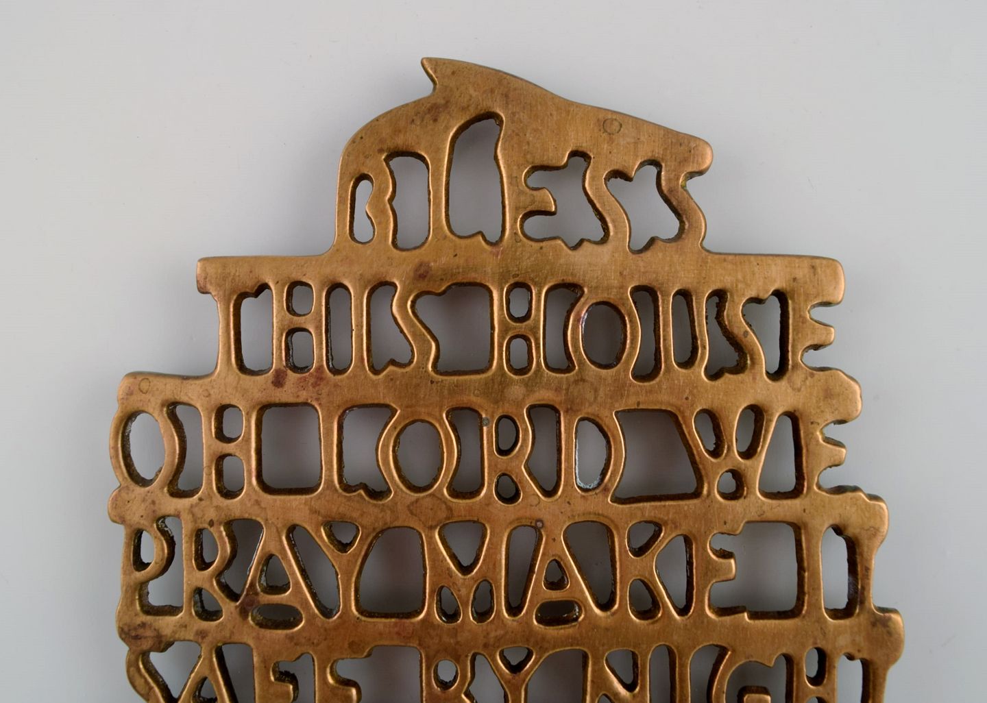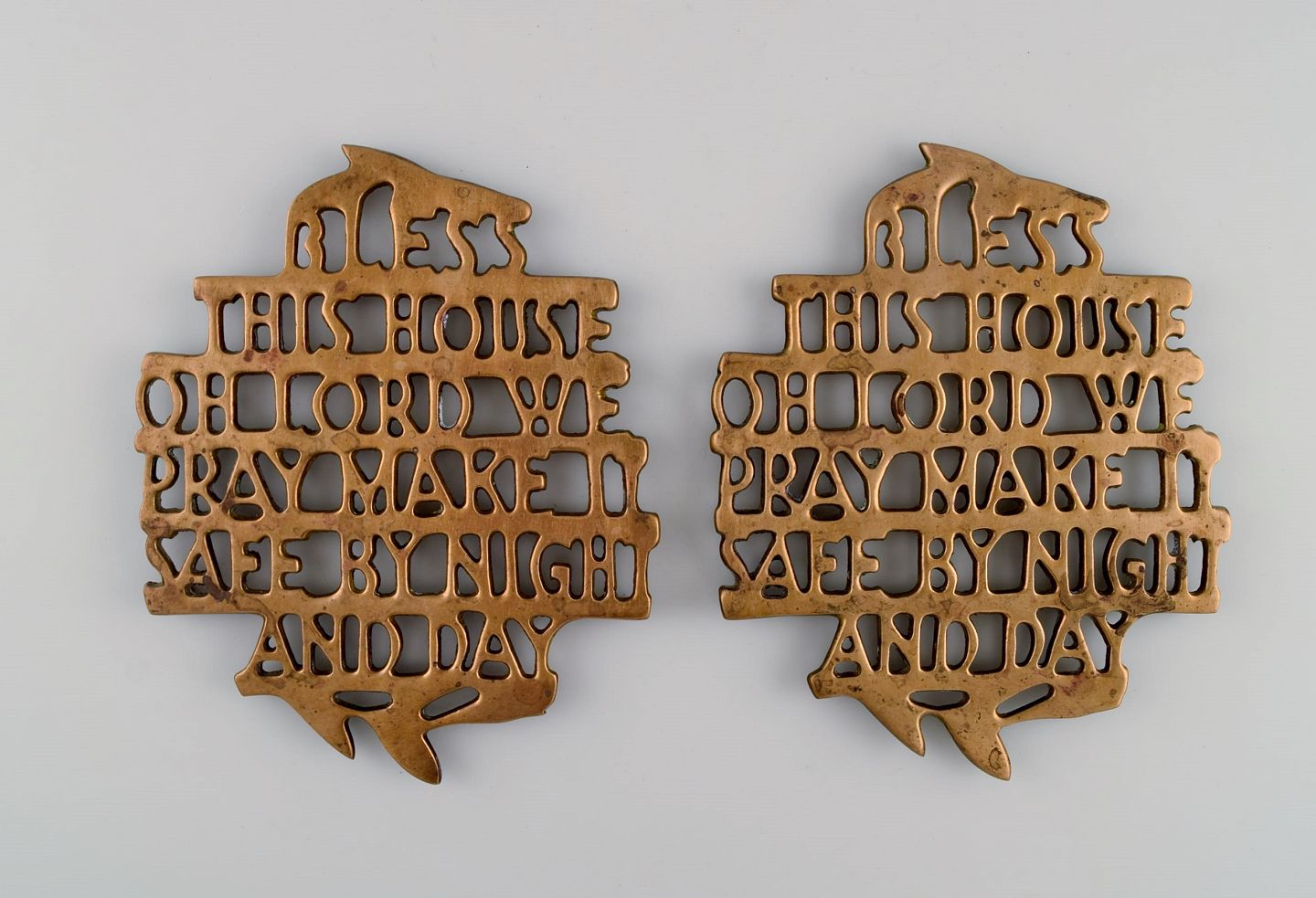 Estrid Ericson for Svenskt Tenn, Stockholm. To "Bless this house" bordskånere i messing. Midt 1900-tallet.