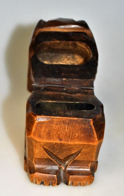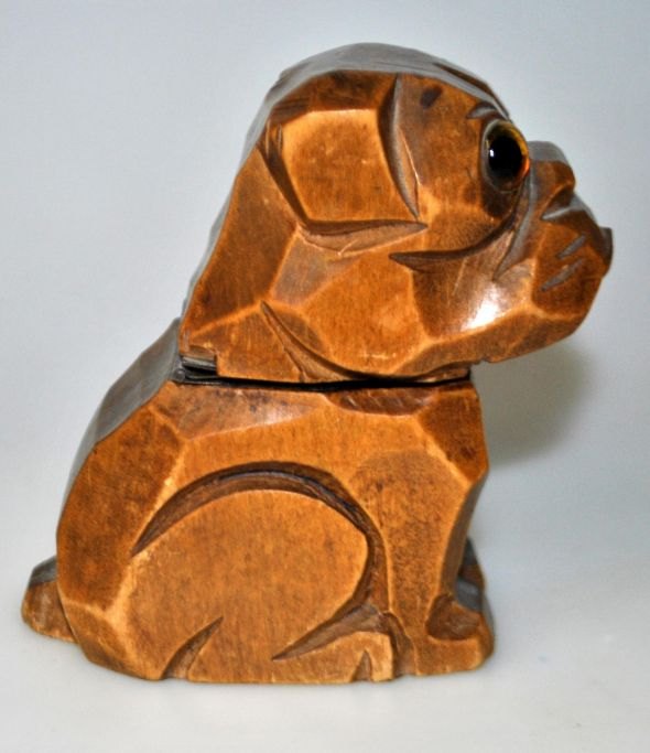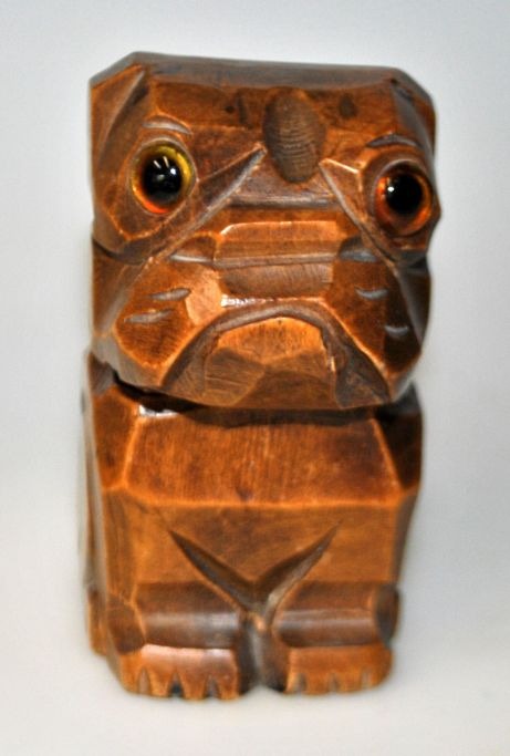 Ink house shaped like a bulldog, 19th century Carved birch tree with glass eyes. Interior ink hous in iron tin. H: 9 cm.