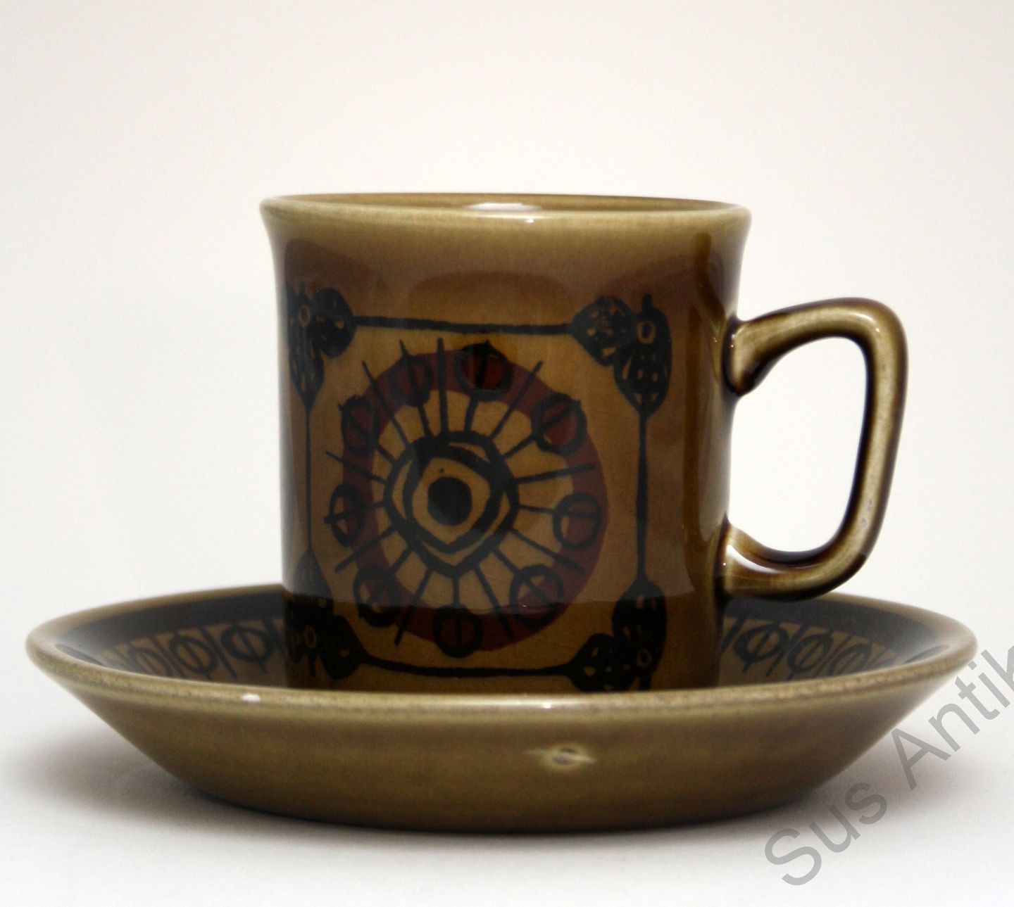 Text available in Danish: Stavangerflint, Norway, Sera. Dekoreret af Inger Vaage og designet af Kåre Berven Fjeldsaa. Kaffekop med underkop. Højde 7,5 cm. Diameter 6,5 cm. Lettere overfladekrakelering på enkelte. Pris: 75 kr. stk. Lager: 1