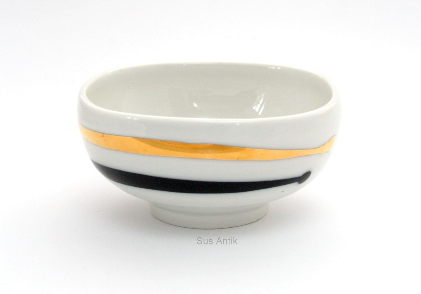 Text available in Danish: Royal Copenhagen, Congratulations, Lille skål med sort og guldstriber.