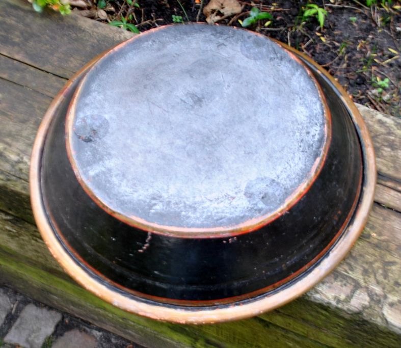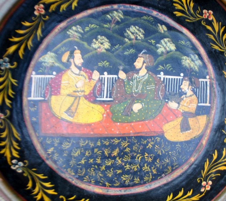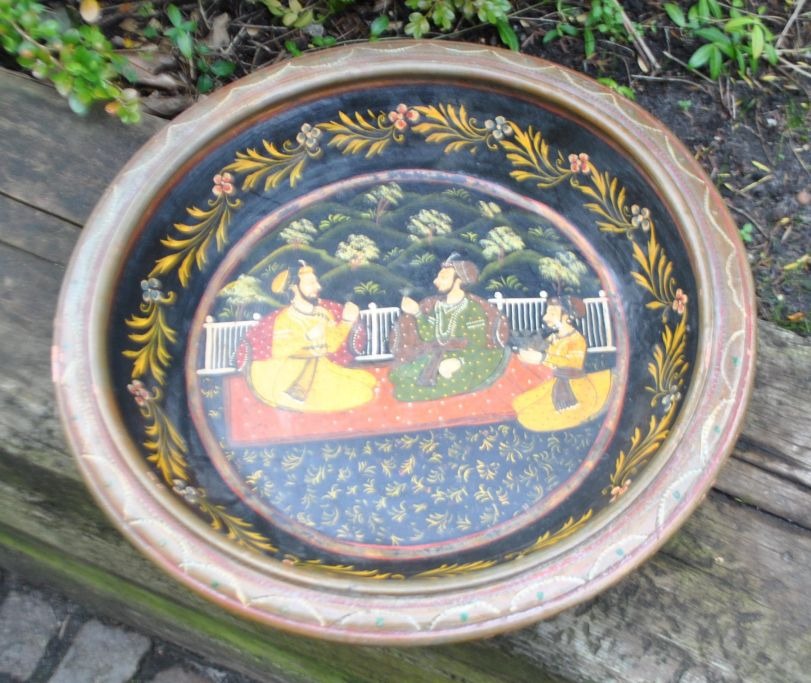 Stort persisk håndbemalet fad i ler, 19.årh. Scene med to siddende mænd, der drikker vin og en tjener. Polykrom dekoration. Højde.: 10,5 cm. Dia.: 42 cm.