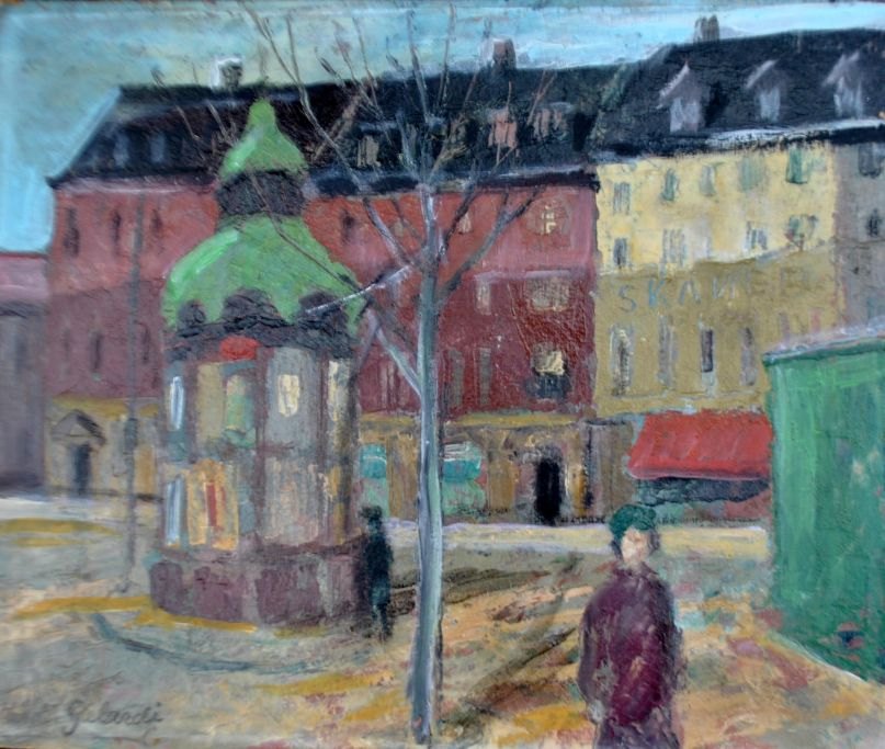 Gerlardi, Herdis (1916 - 1991) Danmark: Scene fra København med bladkiosk. Olie på pap. Signeret. 28 x 35,5 cm.