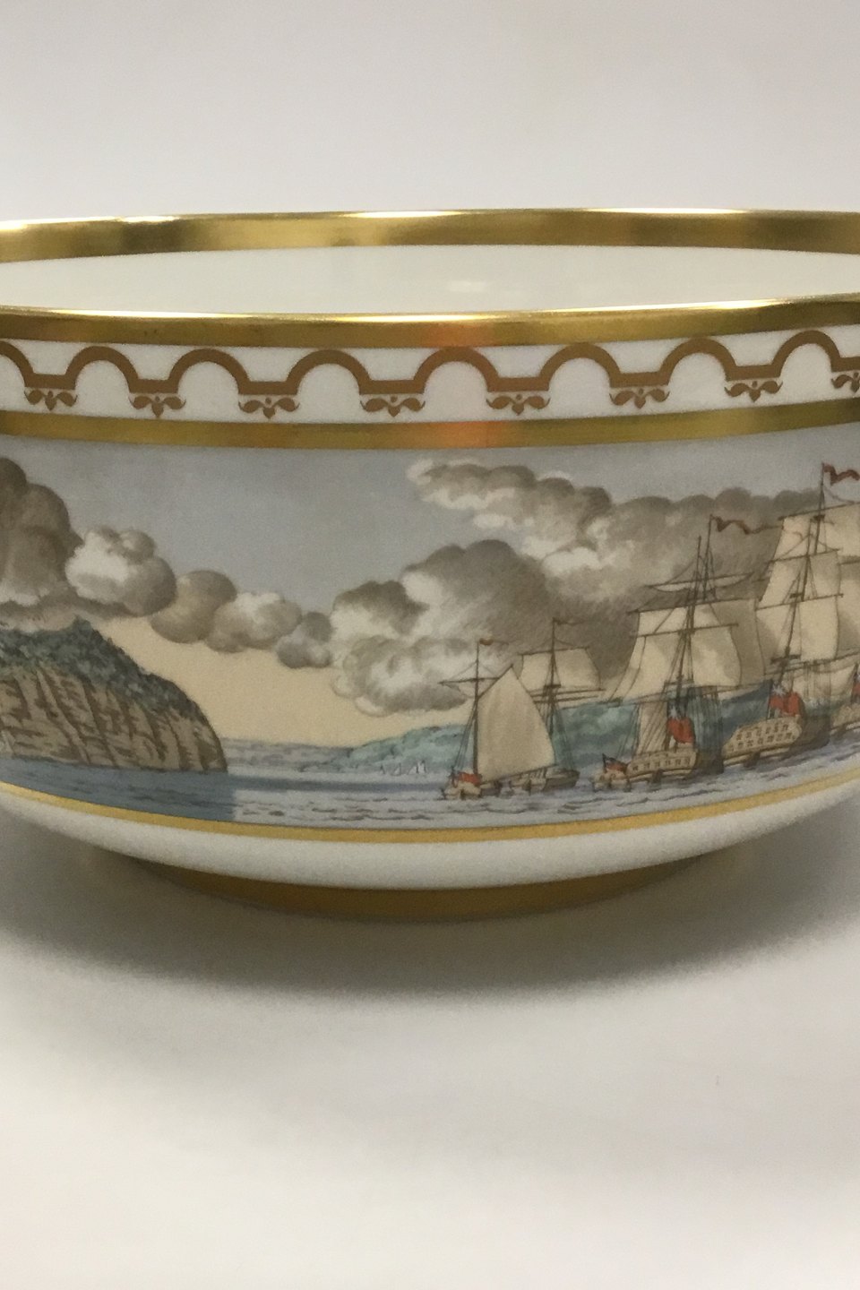 Royal Copenhagen Jubilæums Bowle, The American Revolution 1776-1976 dekoreret i farver og guld med prospekter fra USA, 1776-1976. Udført i anledning af Den Amerikanske Revolutions 200-års jubilæum. Måler 15 x 33 cm (5 29/32 x 12 63/64 in). 1.sortering.