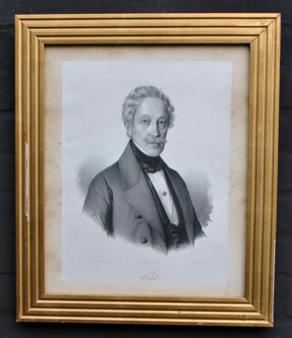 Antik dansk forgyldt ramme, 19. årh. Med litografi af Krogh. Udført af maleren N. P. Holbech og udført hos I. W. Tegner. 50 x 42 cm.