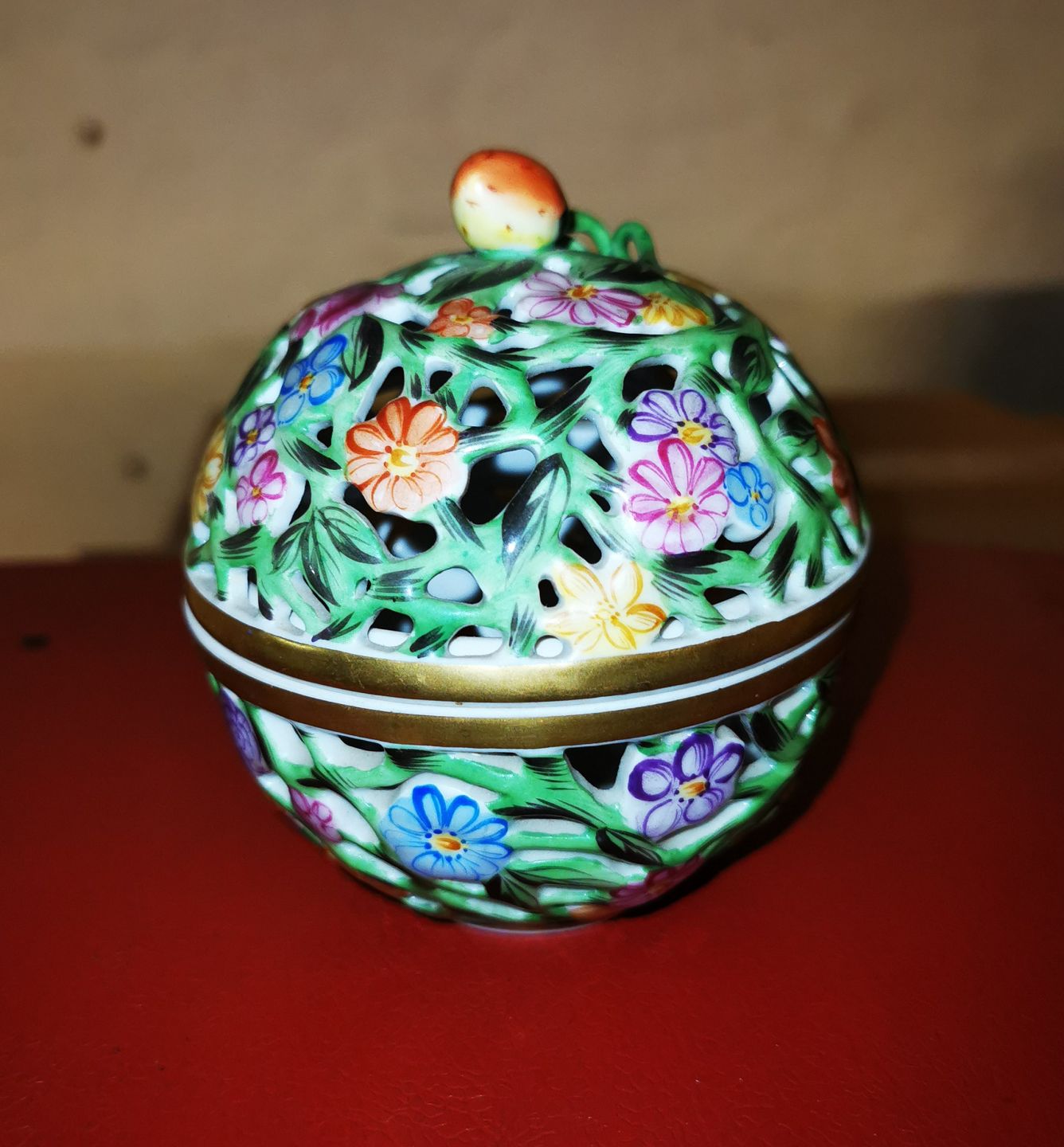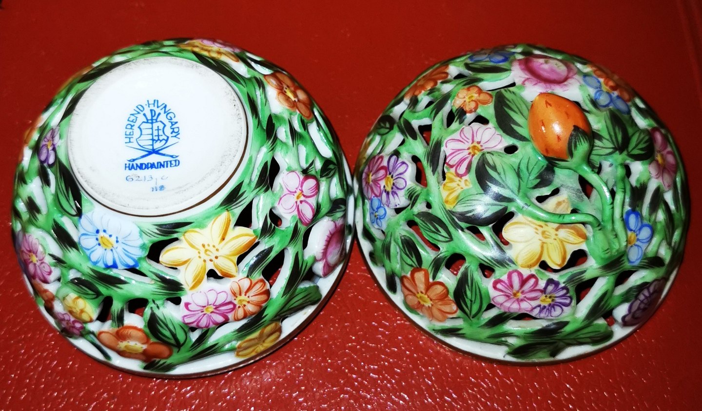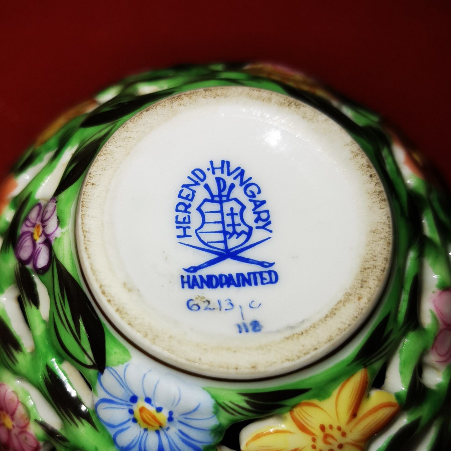 Herend, Ungarn: Lille bemalet lågskål med gennembrud på både underdel -og overdelen. Dekoreret med blomster. Fremstår i god stand uden skader eller reparationer. Fabriksmærket på bunden. H. 10½ cm.