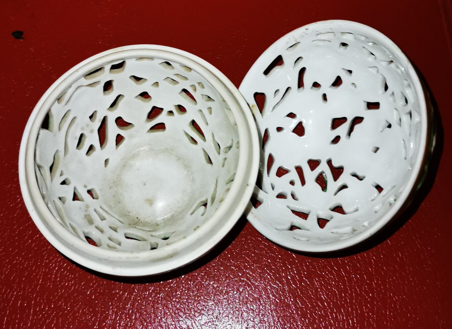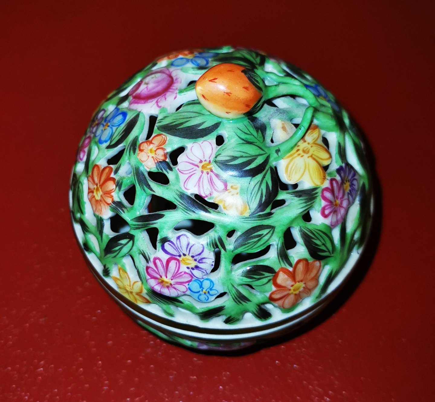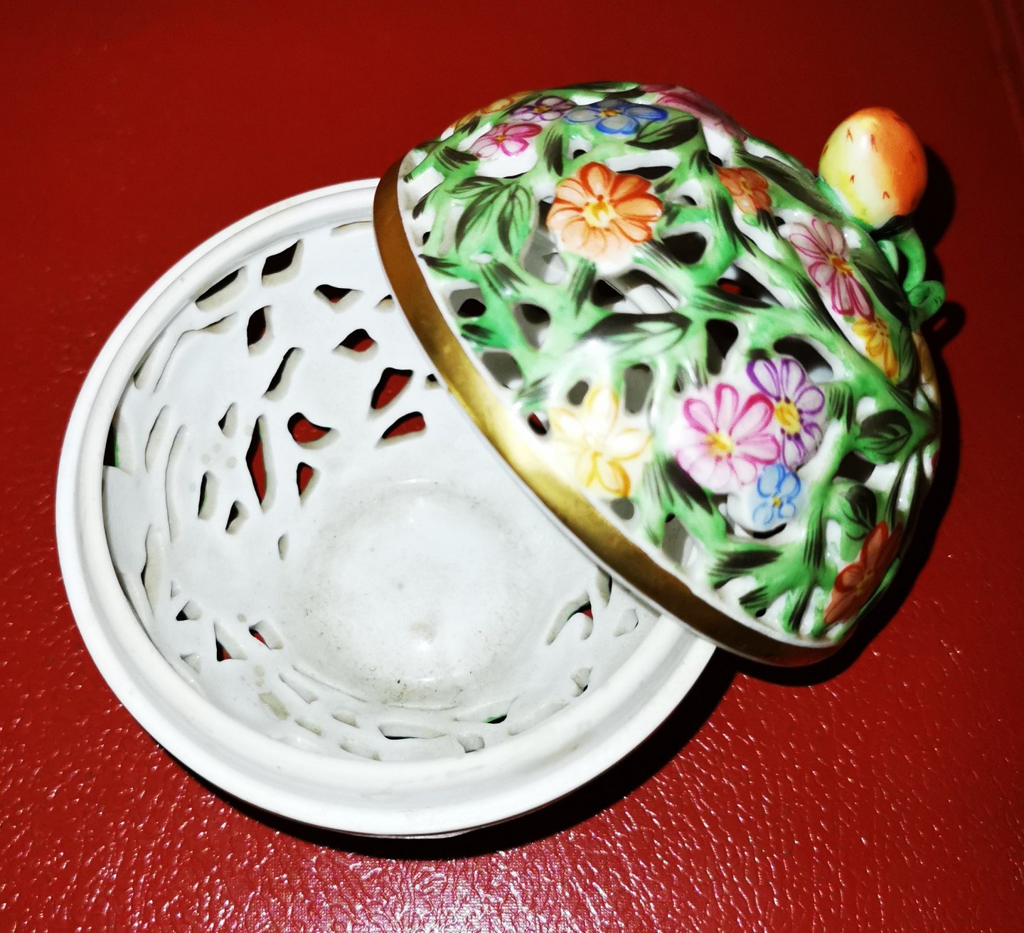 Herend, Ungarn: Lille bemalet lågskål med gennembrud på både underdel -og overdelen. Dekoreret med blomster. Fremstår i god stand uden skader eller reparationer. Fabriksmærket på bunden. H. 10½ cm.