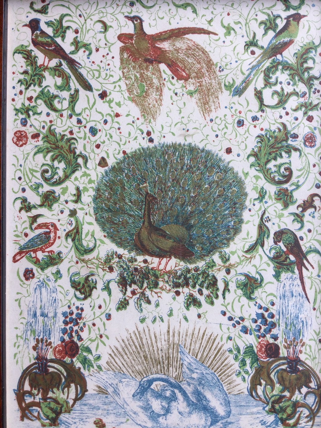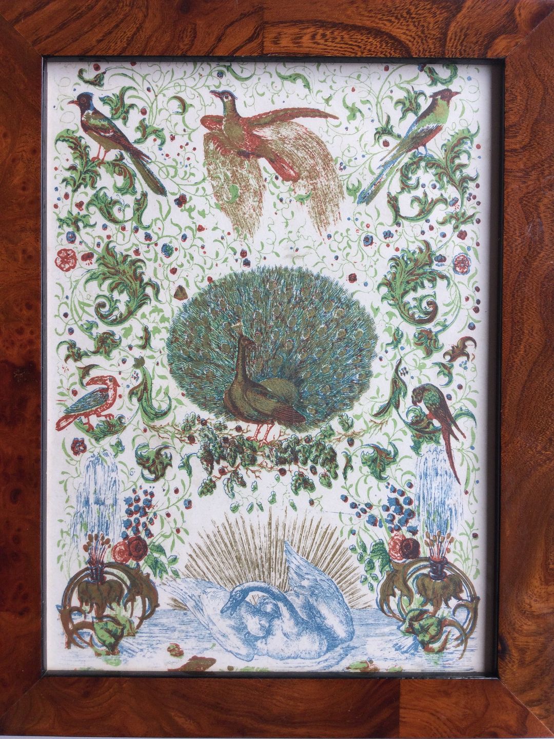Litografi - komposition med påfugl og andre fugle - prøveark.