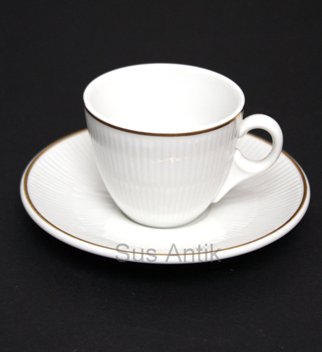 Royal Copenhagen, Jernporcelæn (hotelporcelæn), Hvid riflet med guldkant. Kaffekop med underkop. Højde 6,5 cm. Diameter 8 cm.