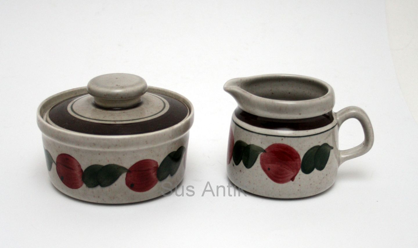 Rørstrand, Birgitta. Gråt stoneware med håndmalede blomster og brun kant. Sukker og fløde sæt.