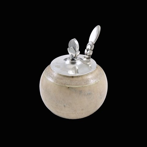 Saxbo - Georg Jensen. Krukke i stentøj med 'Kaktus' låg og ske i sterlingsølv.