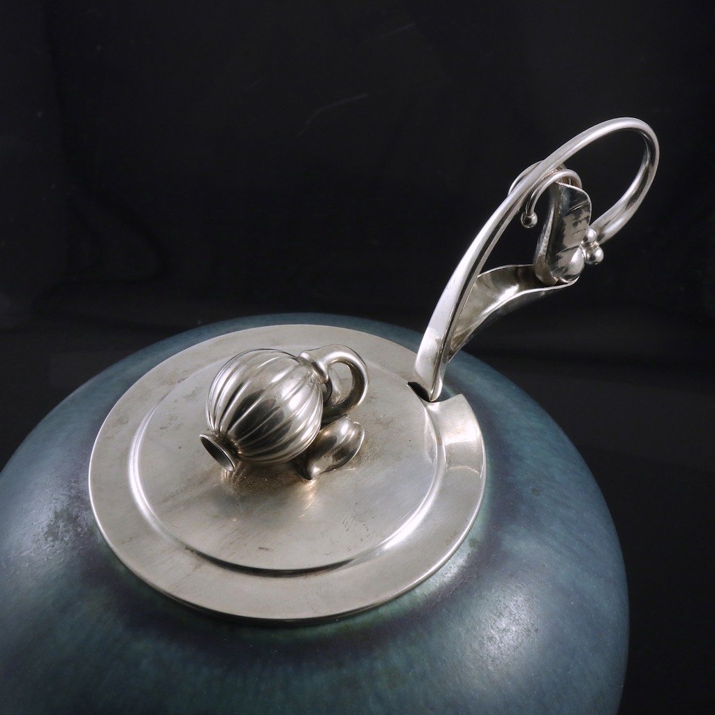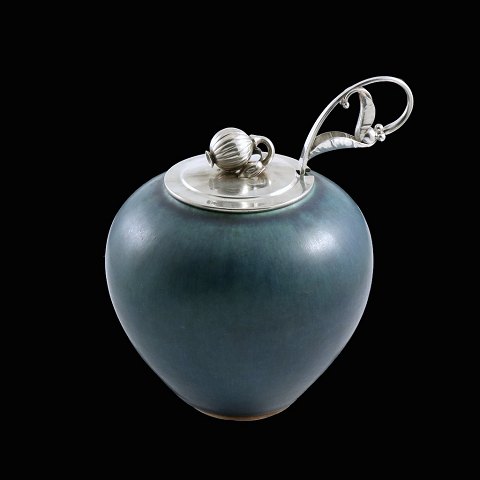 Saxbo - Georg Jensen. Krukke i stentøj med låg og ske i sterlingsølv.