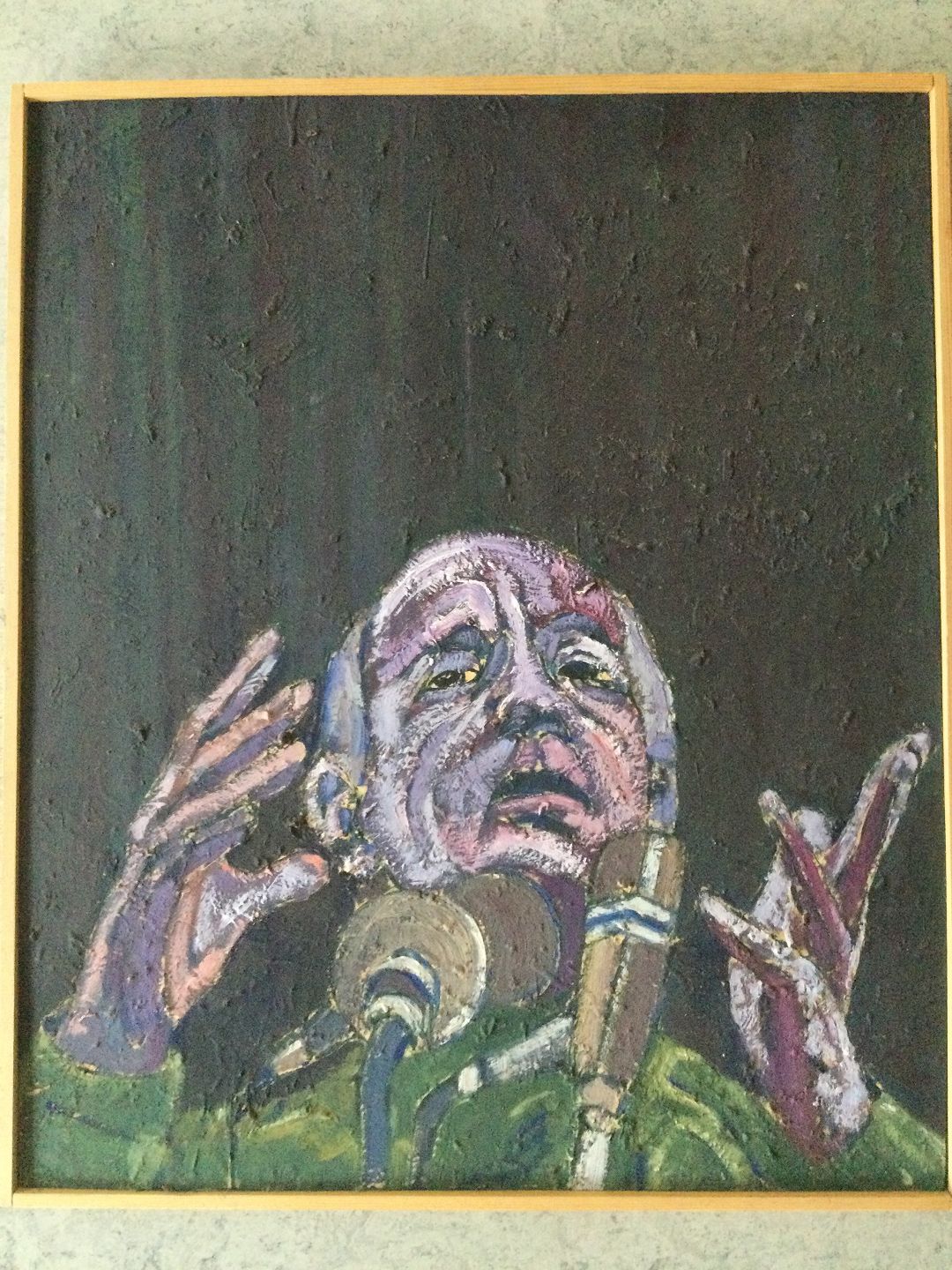 Maleri af Torben Heron 1973 - Portræt af mand på talerstol med mikrofoner.