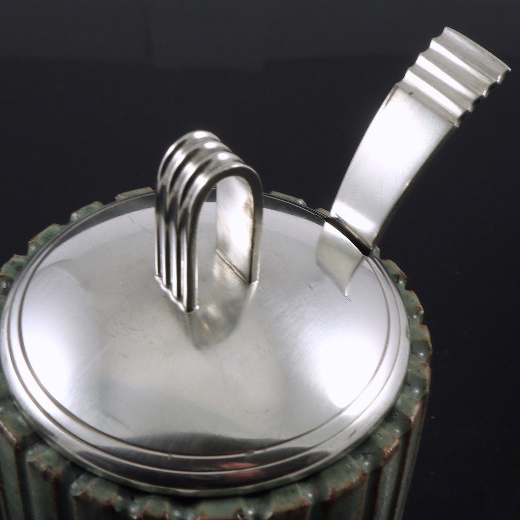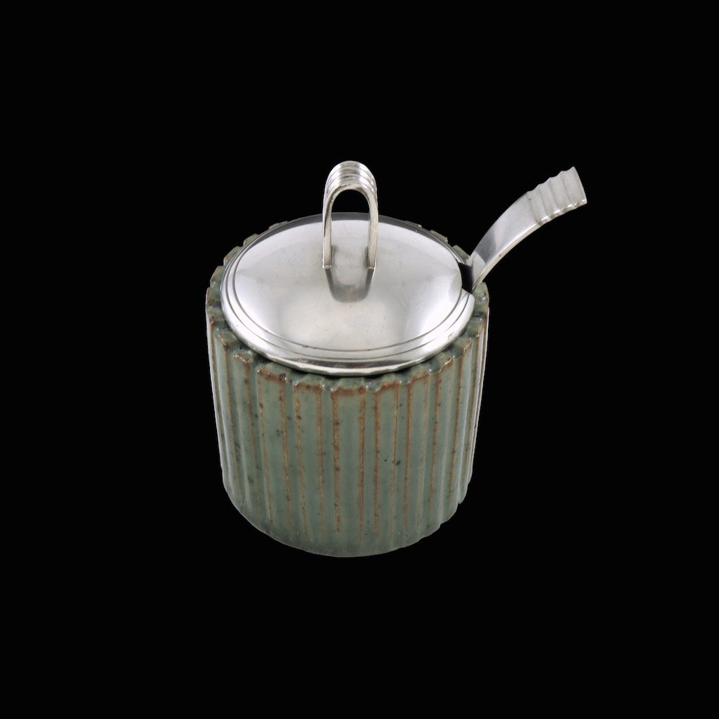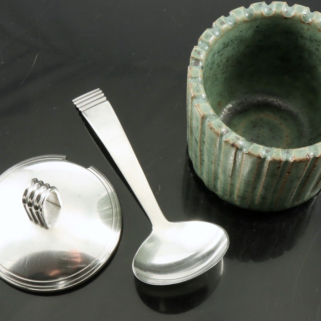 Arne Bang - Hingelberg. Krukke i stentøj med låg samt ske i Sterling Sølv.