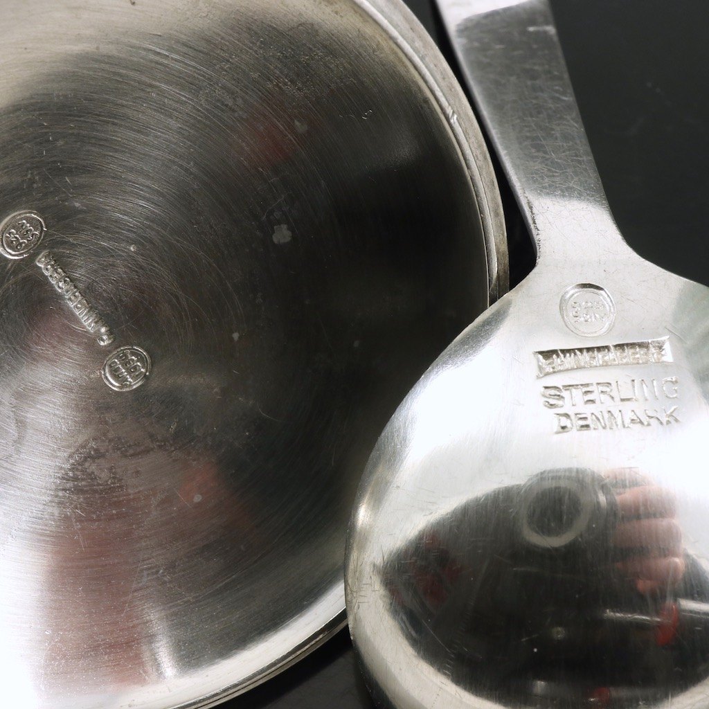Låg samt ske i sterling sølv designet af Svend Weihrauch (1899-1962) og udført hos F. Hingelberg in Aarhus, Denmark.