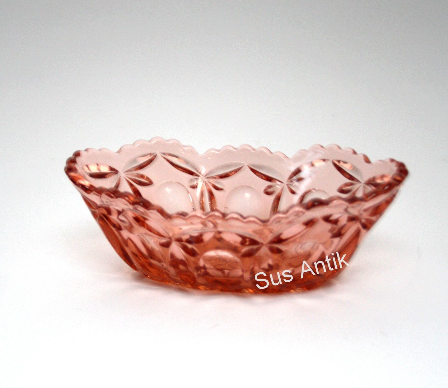 Fyens Glasværk, Rolf lettere rosa presset glas. Produceret fra 1934 og frem. Jardiniere (oval skål). Længde 18 cm. Bredde 10 cm. Højde 6 cm. Pris: 150 kr. stk. Lager: 3