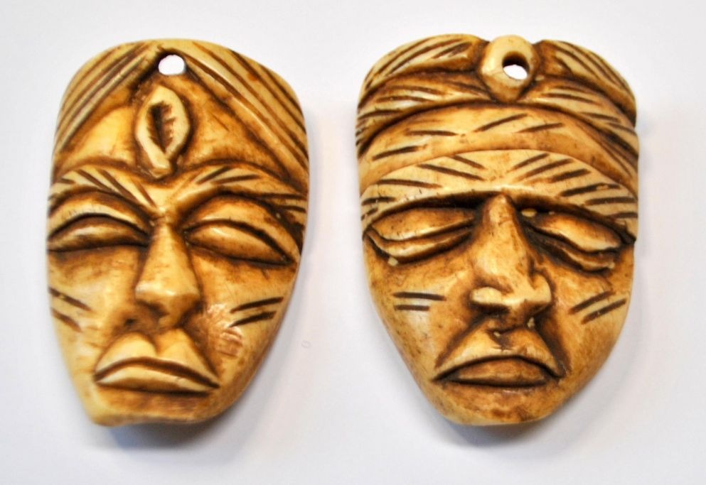 To afrikanske småmasker af udskåret ben, 19./20. årh. Vestafrika. 6,3 x 4,5 cm. Til ophængning med hul.