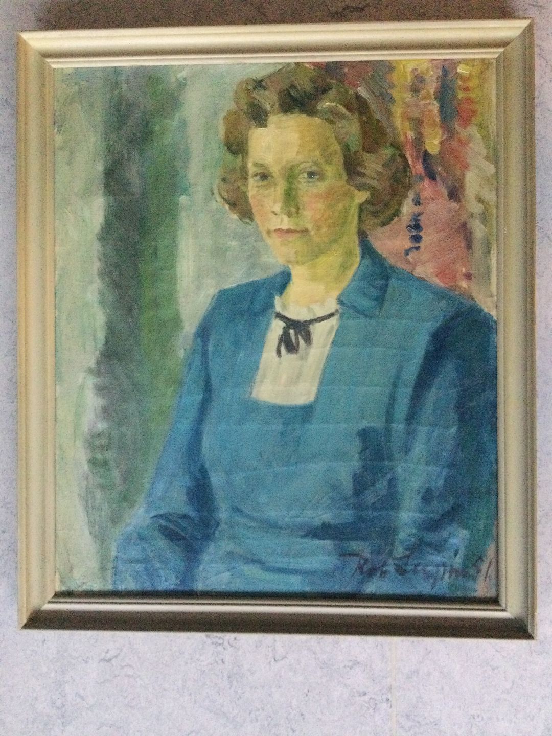 Maleri af Robert Leepin 1951 - Portræt af ung kvinde i lyseblå kjole.