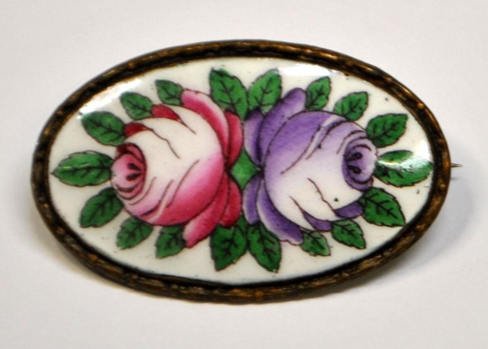 Emalje brosche med roser, oval, 19. årh.