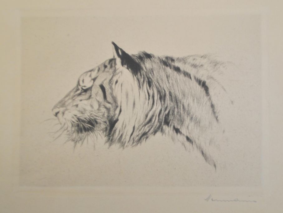Dansk kunstner (19. årh.): En tiger. Radering. Signeret. Størrelse tryk: 15 x 20,5 cm.