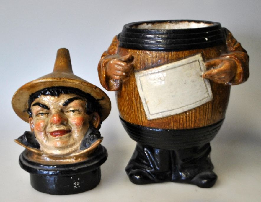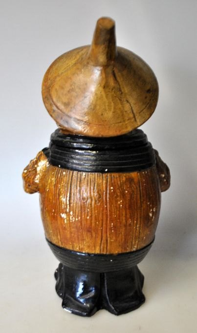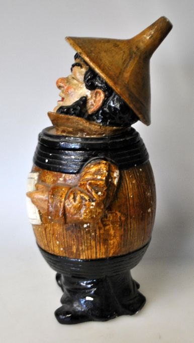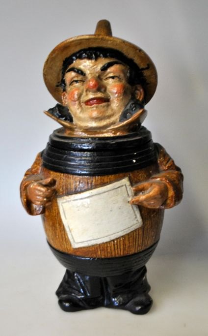 Antik bemalet tobakskrukke i gips, 19. årh. Tyskland. Håndmalet. Udformet som en mand i en tønde med store bakkenbarter. Figuren bærer en spidshat. H: 26 cm.