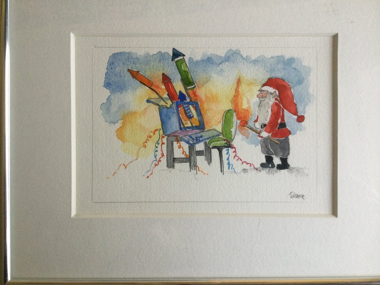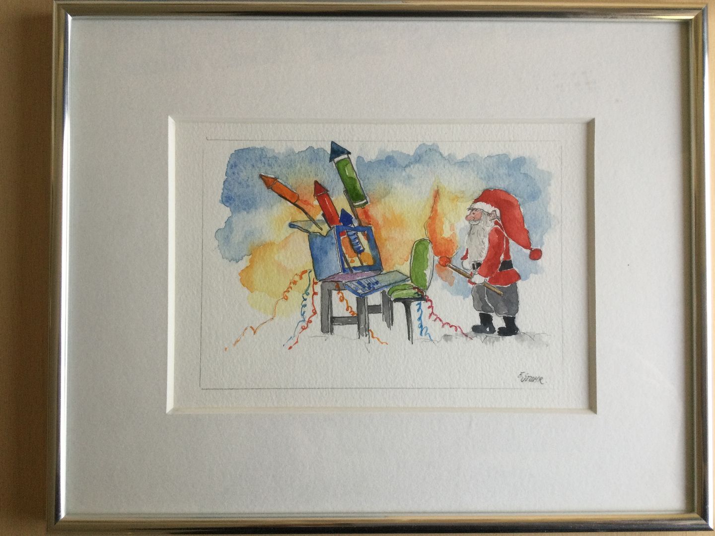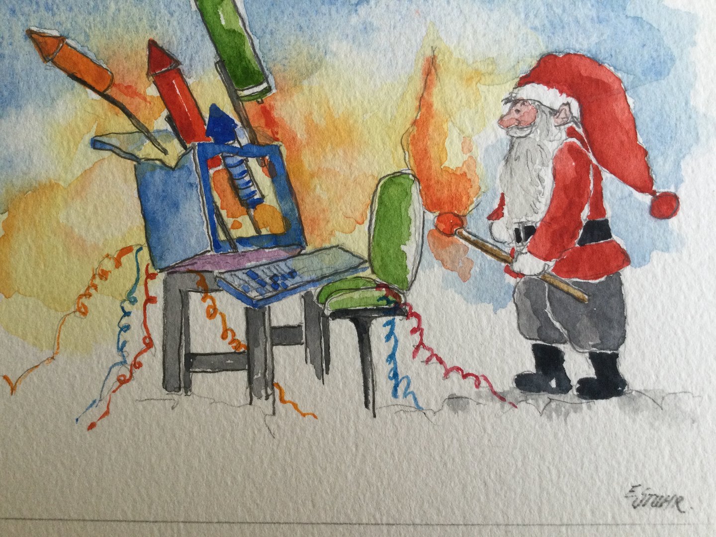 Akvarel af Erik Stuhr - Julemand og nytårs skyts.