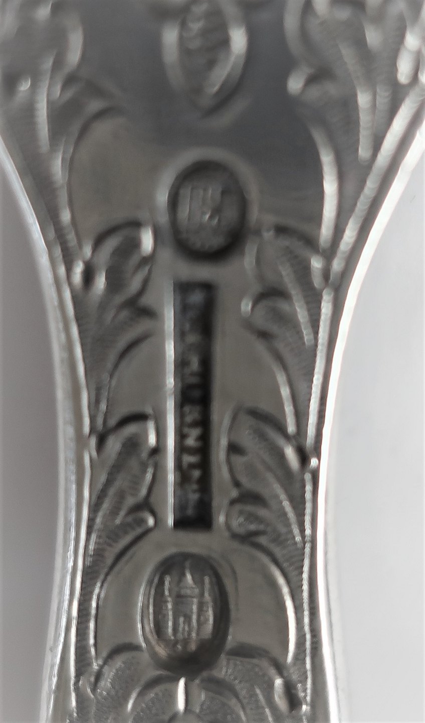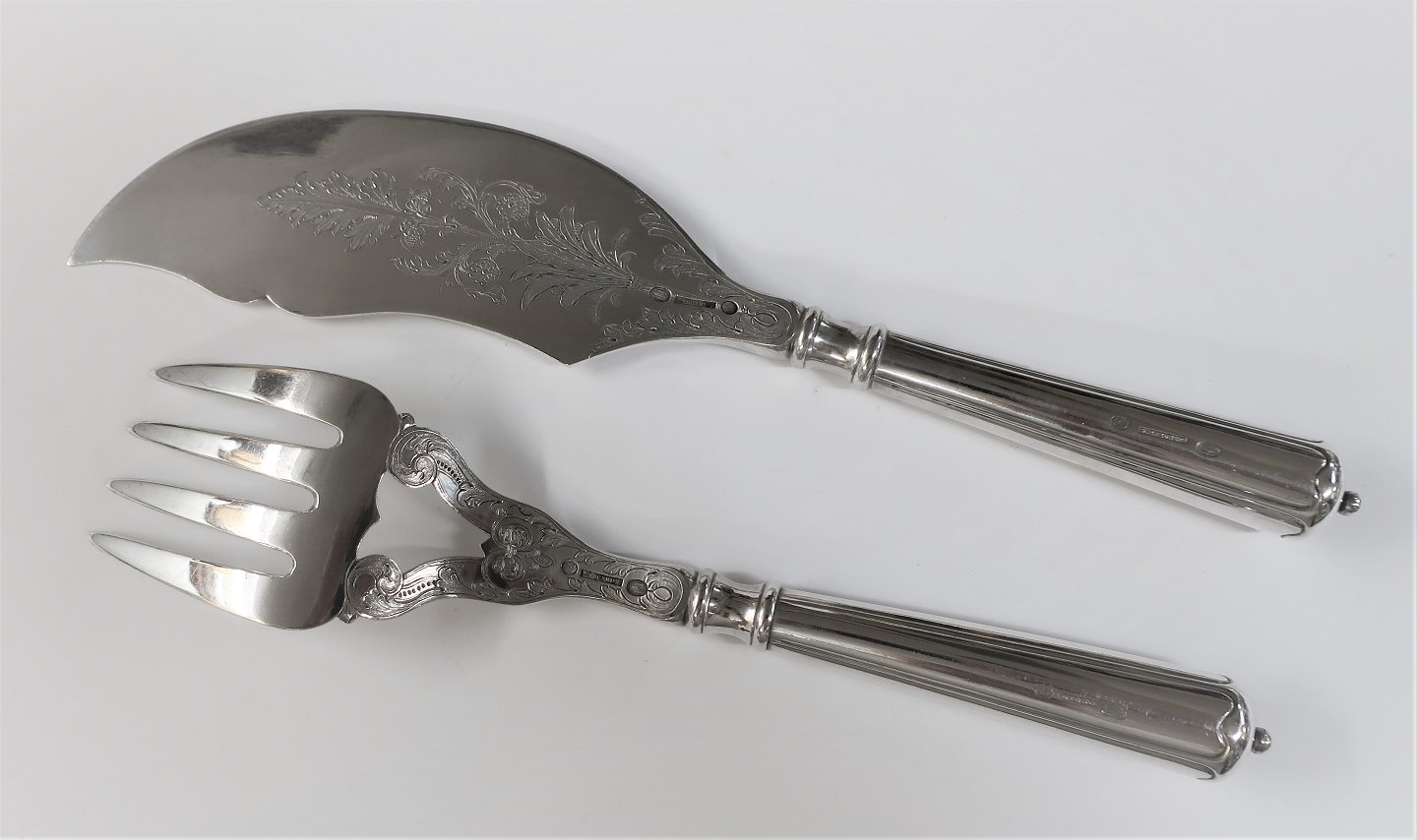 J. C. Thorning, København. Sølvbestik (830). Stort flot fiskeserverings bestik. Længde 29,5 cm. Produceret 1856.