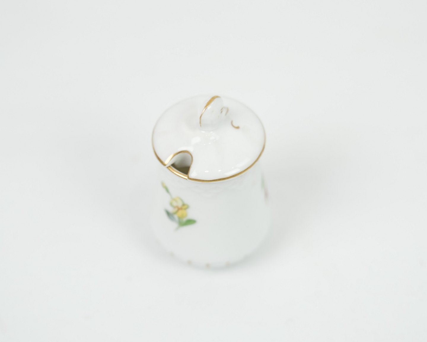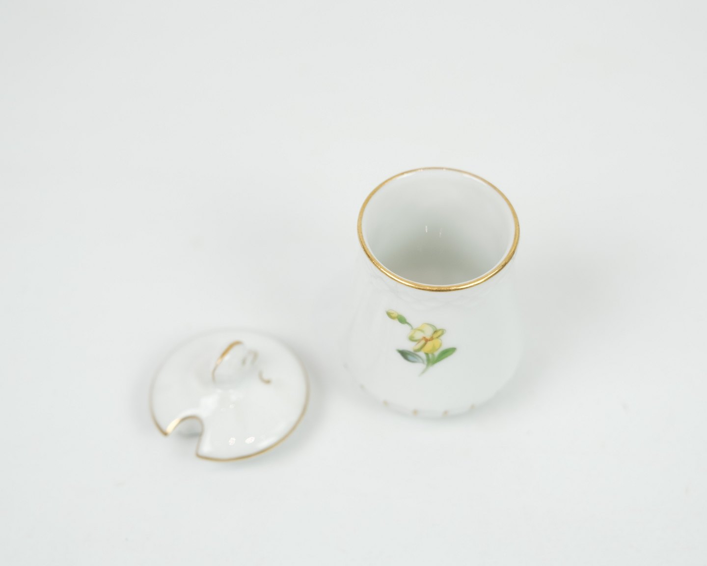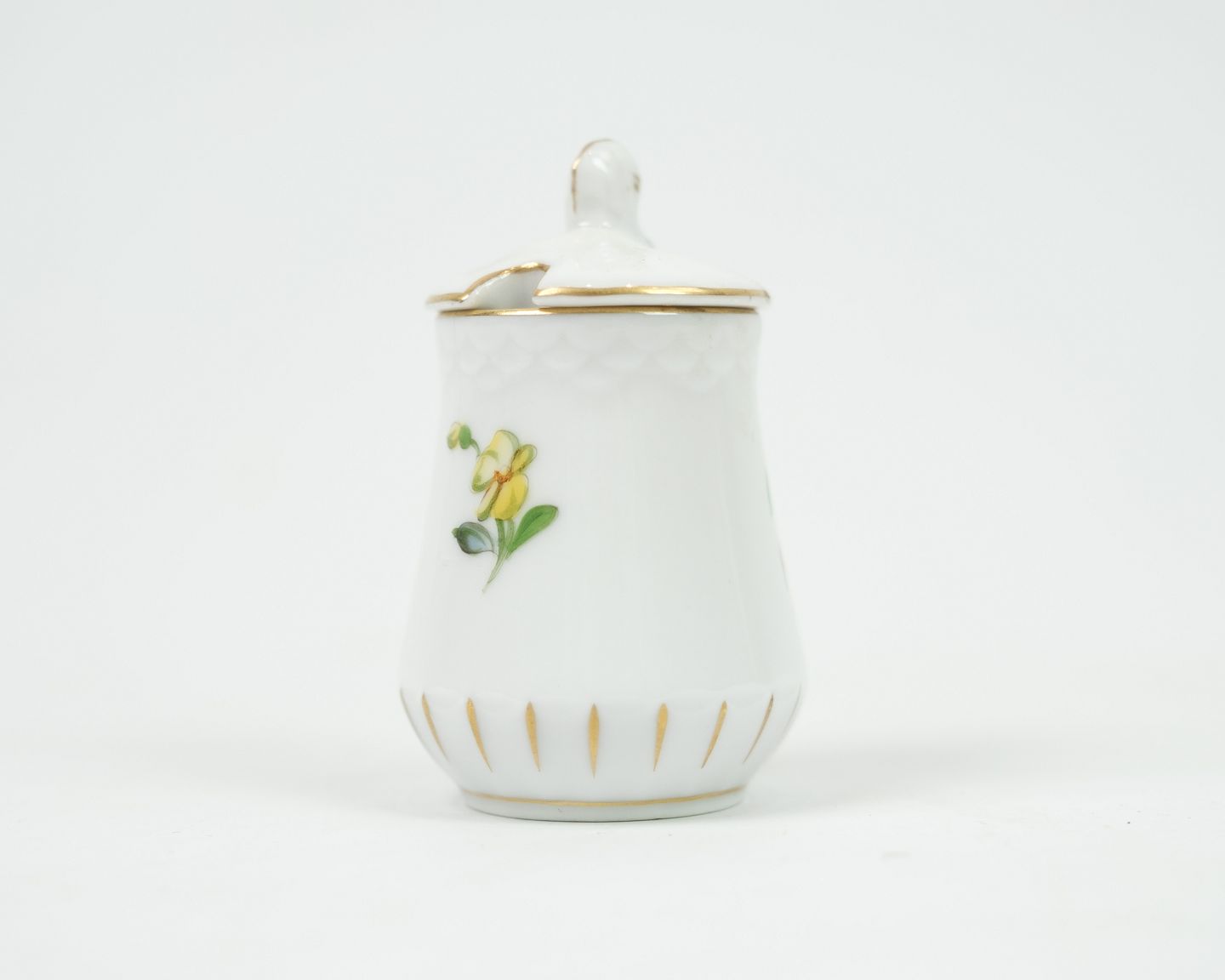 Bing & Grøndahl sennepskrukke i mønstret saksisk blomst. Står hel og intakt