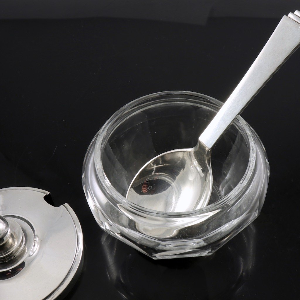 Georg Jensen. Marmeladekrukke med låg og ske i sterlingsølv - Pyramide #600A