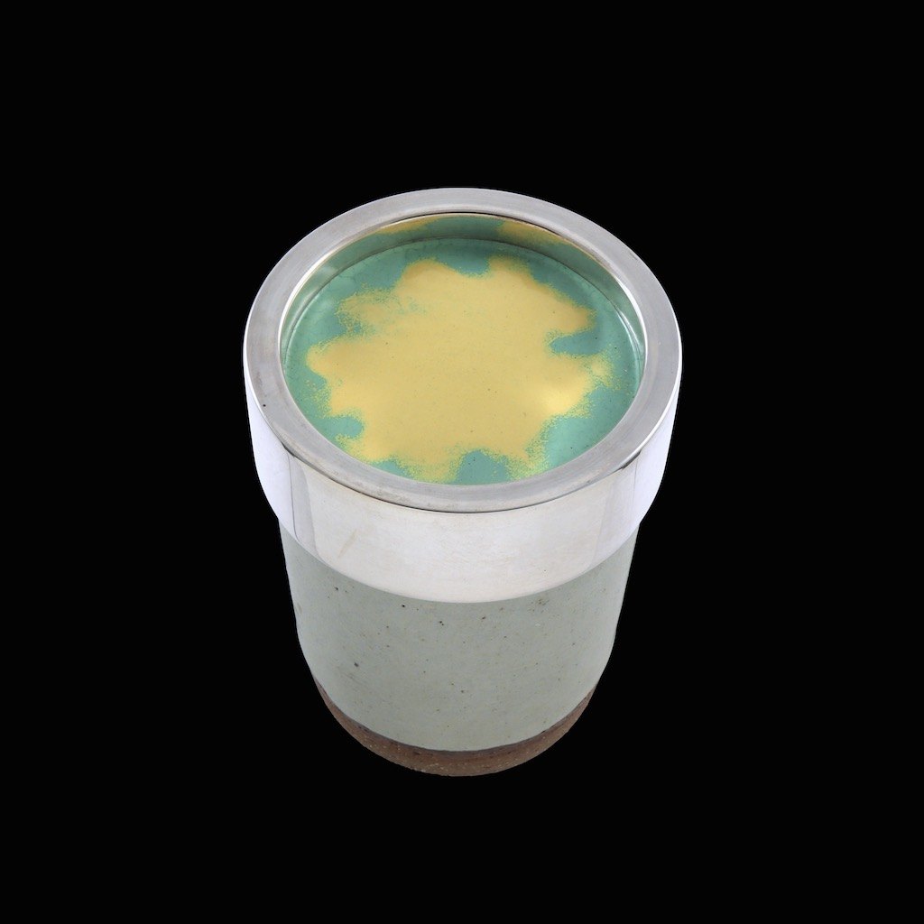 A. Michelsen / Palshus. Krukke i stentøj med låg i sterlingsølv med emalje.