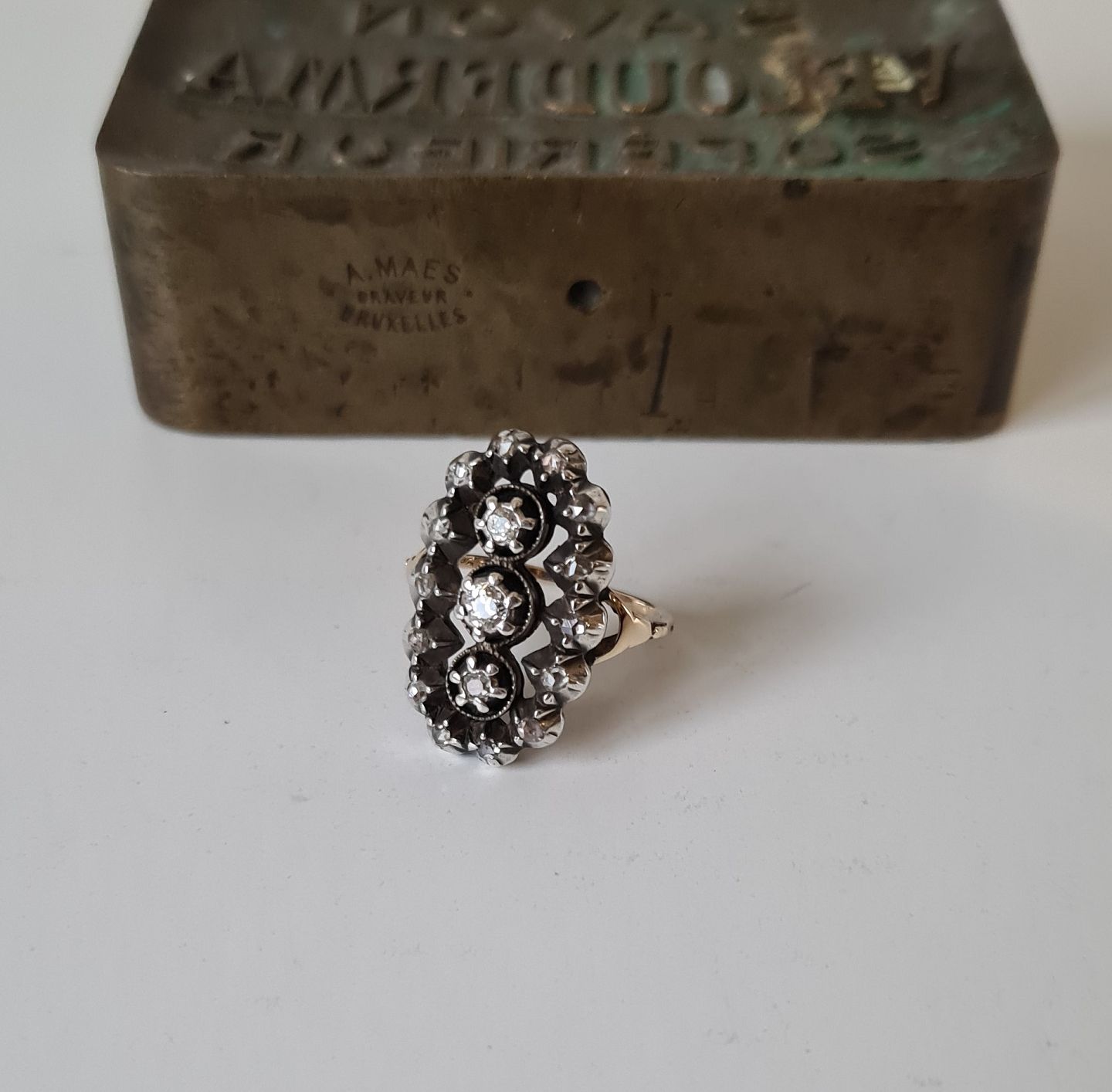 Antik diamantring fra midten af 1800tallet i sølv og 14 kt guld. Diamanterne er fattet i sølv, rammen og ringskinden er udført i 14 kt guld.
